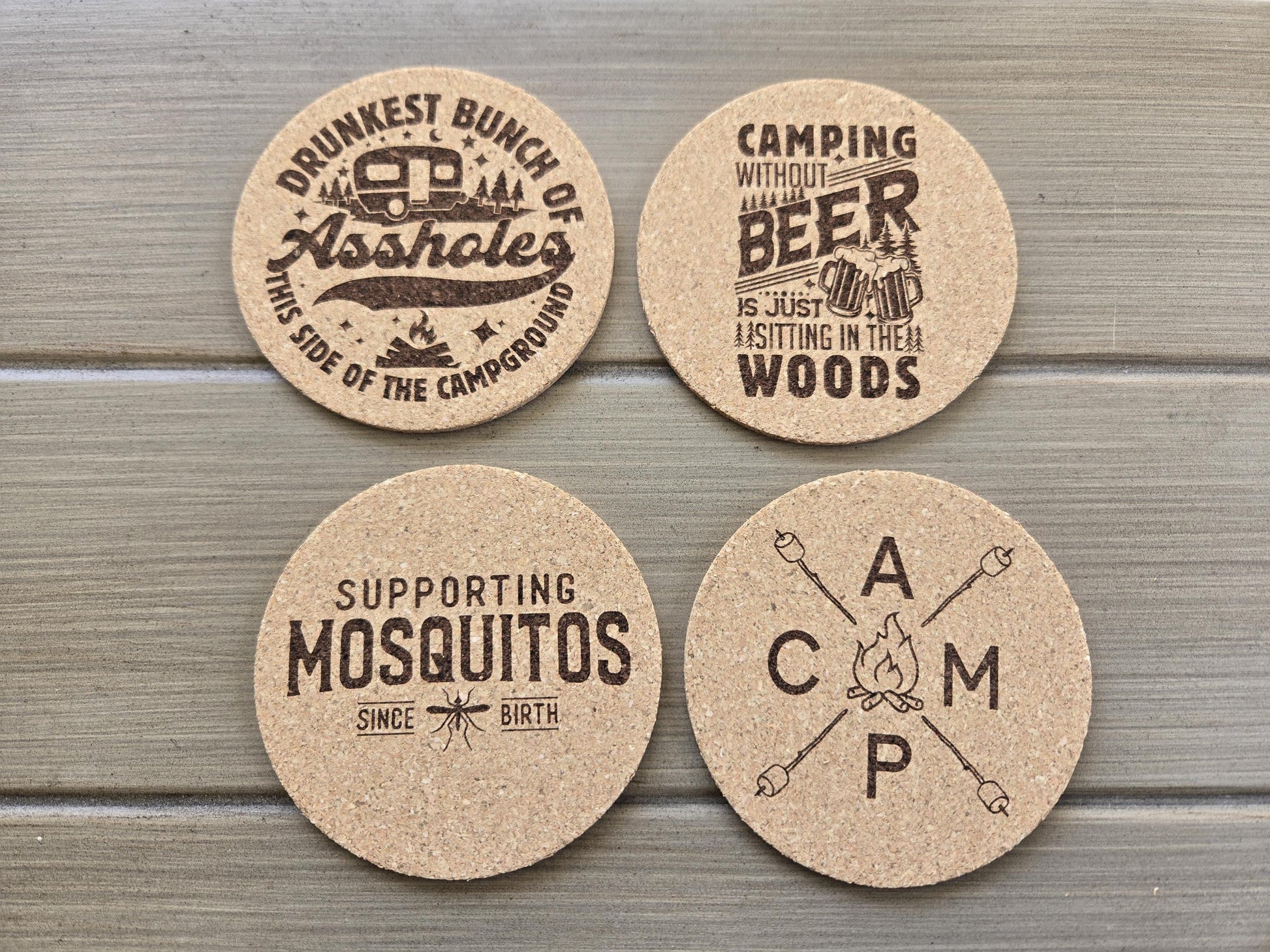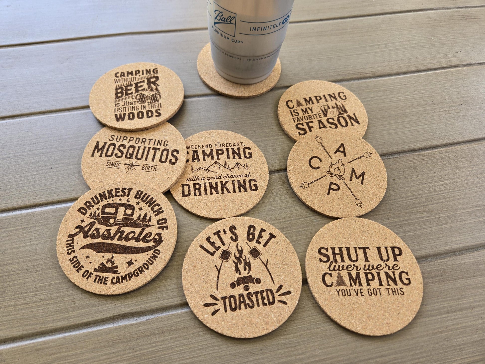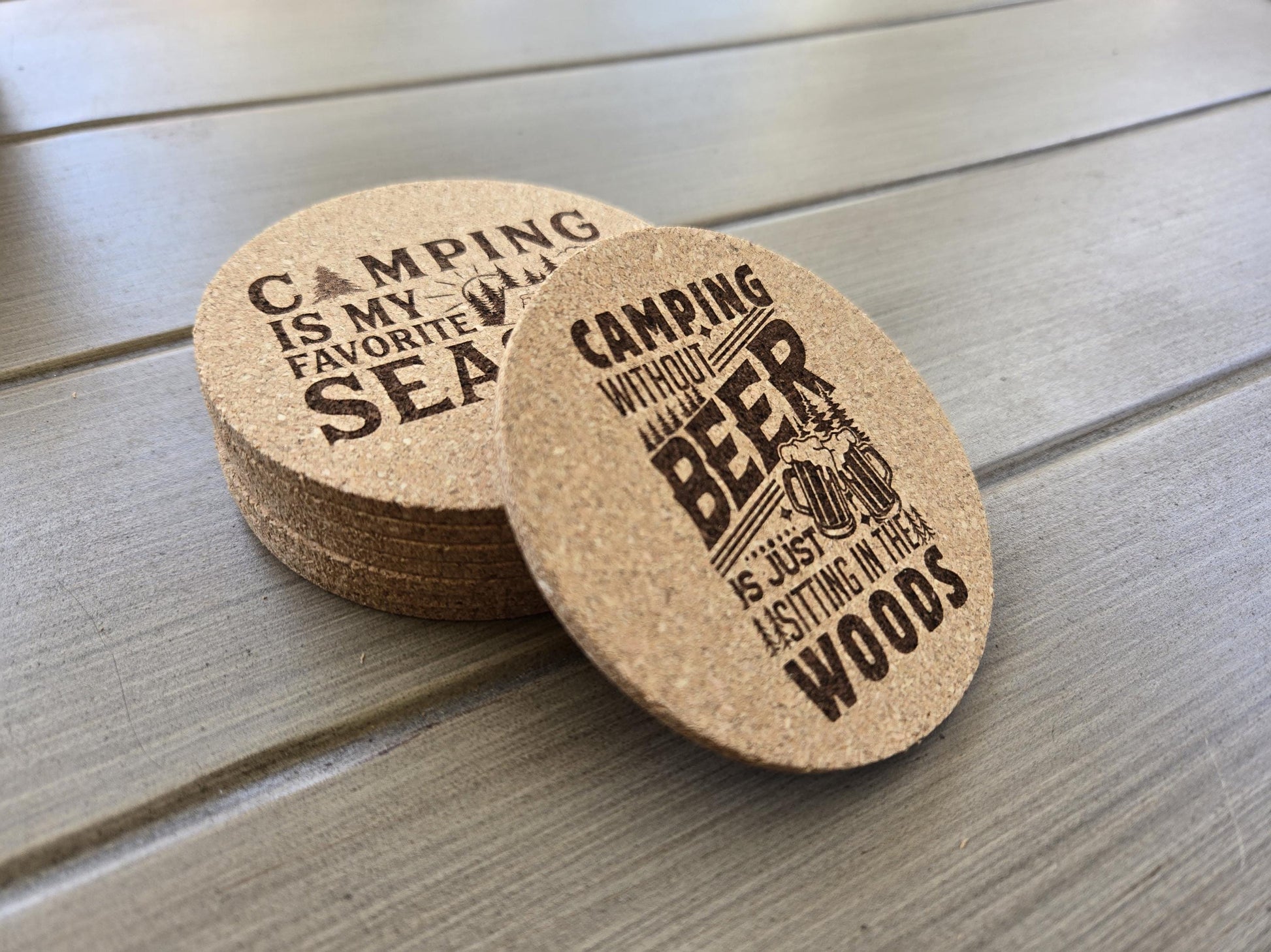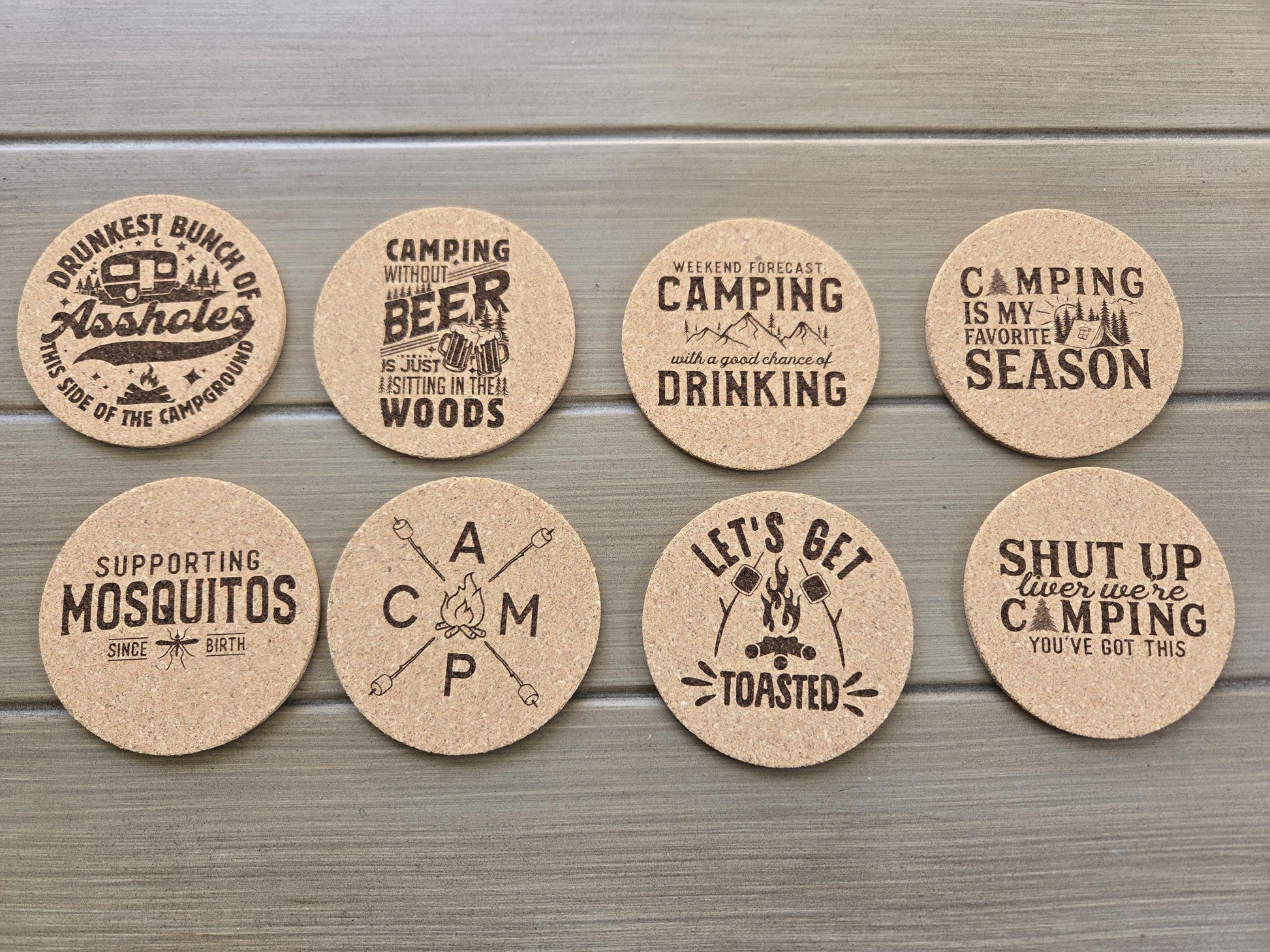 These fun cork camping coasters are perfect for outdoor lovers! Great for RVs, campsites, or as a unique camper gift. Laser engraved and made from eco-friendly cork to protect surfaces while adding a rustic touch to your adventures!
