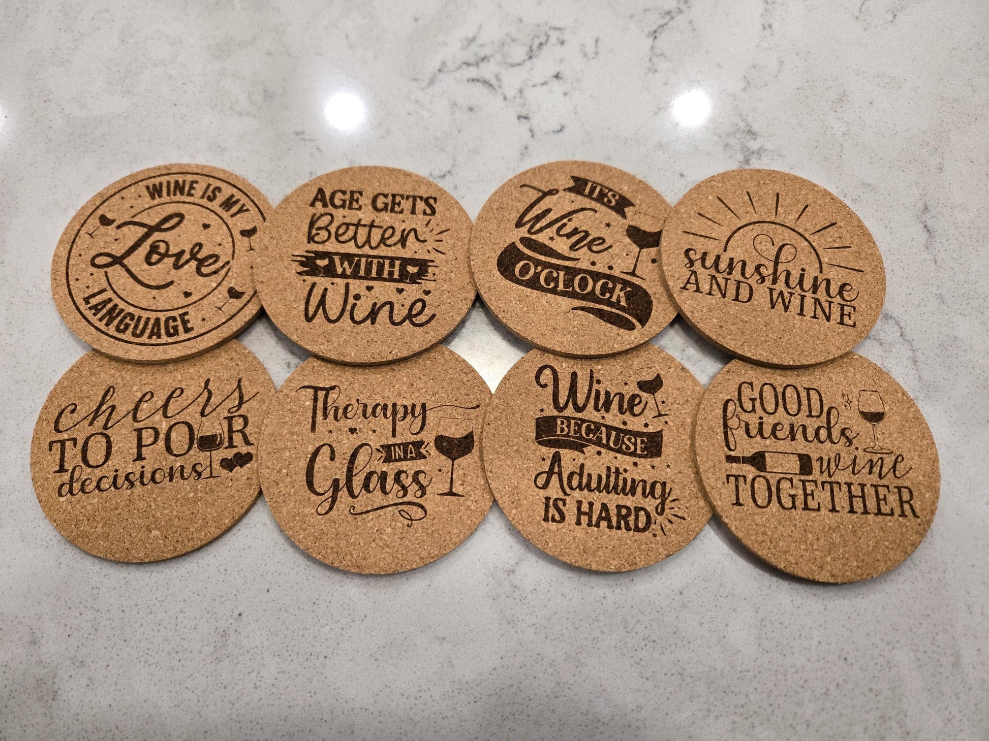 These fun cork coasters make the perfect gift for wine lovers! Eight custom designs laser engraved on round cork coasters. Great for home bars, wine parties, housewarming, or as a unique hostess gift. Made from eco-friendly cork, these coasters protect surfaces while adding charm to any wine night!
