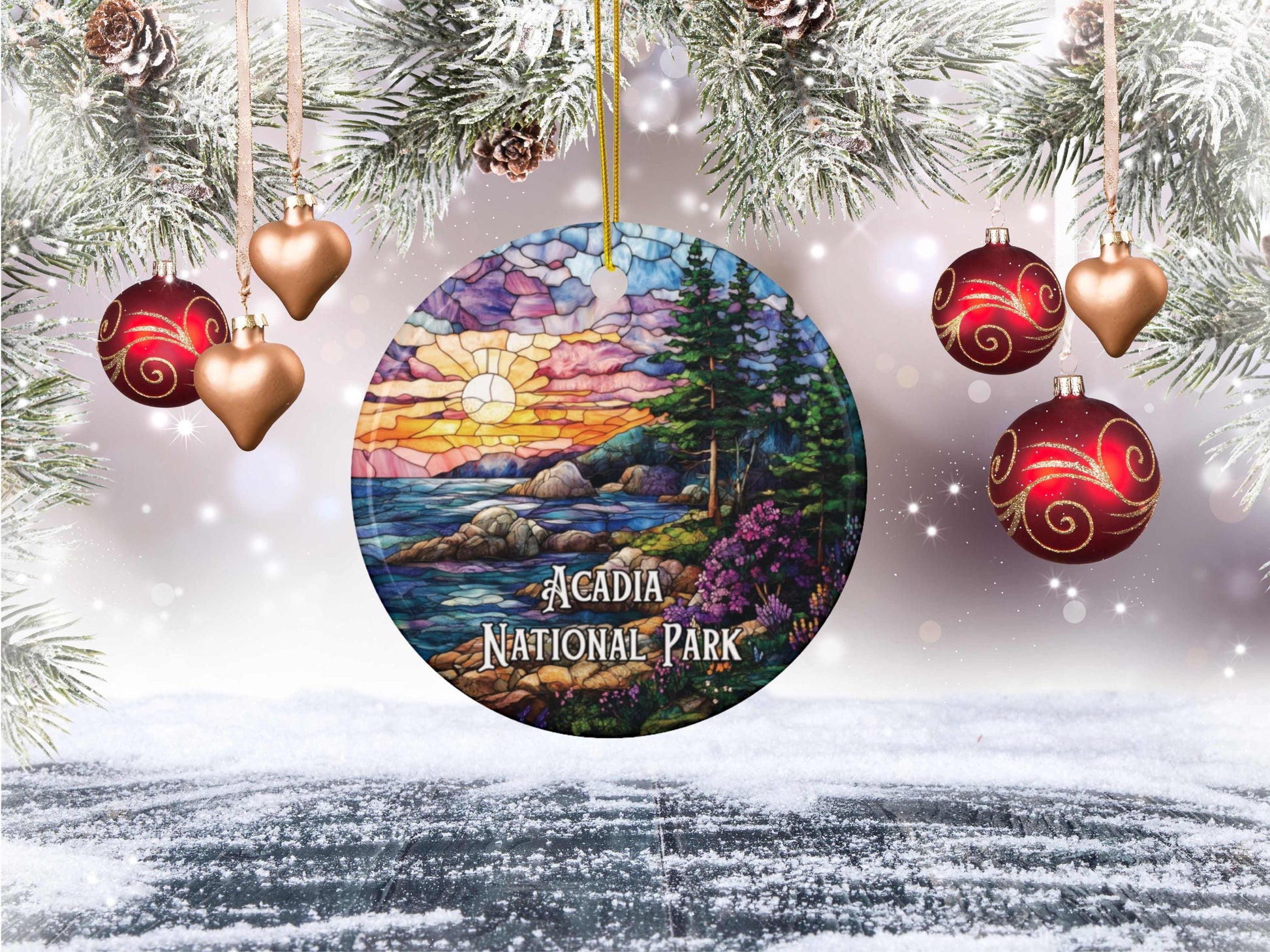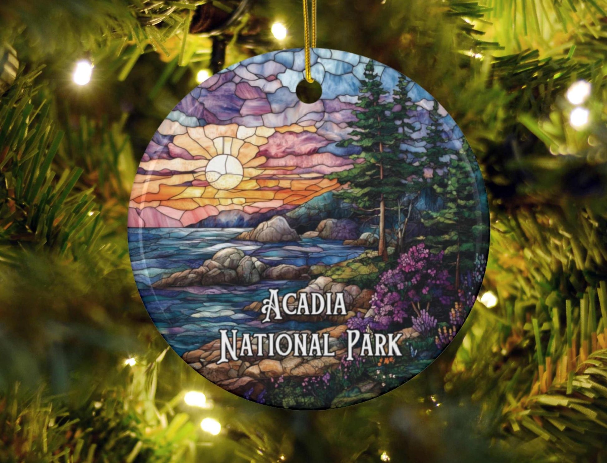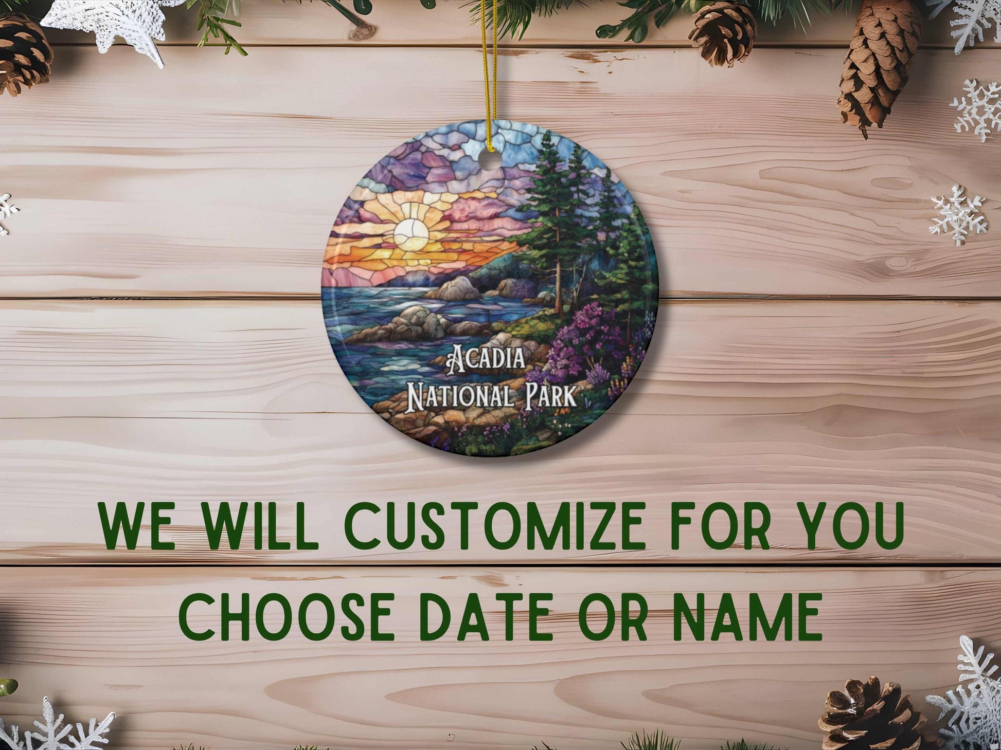 Stunning Acadia National Park ornament with a vibrant coastal sunrise scene, capturing the beauty of Maine's rugged shoreline and natural splendor.We will personalize, just let us know what you would like printed your ornament.