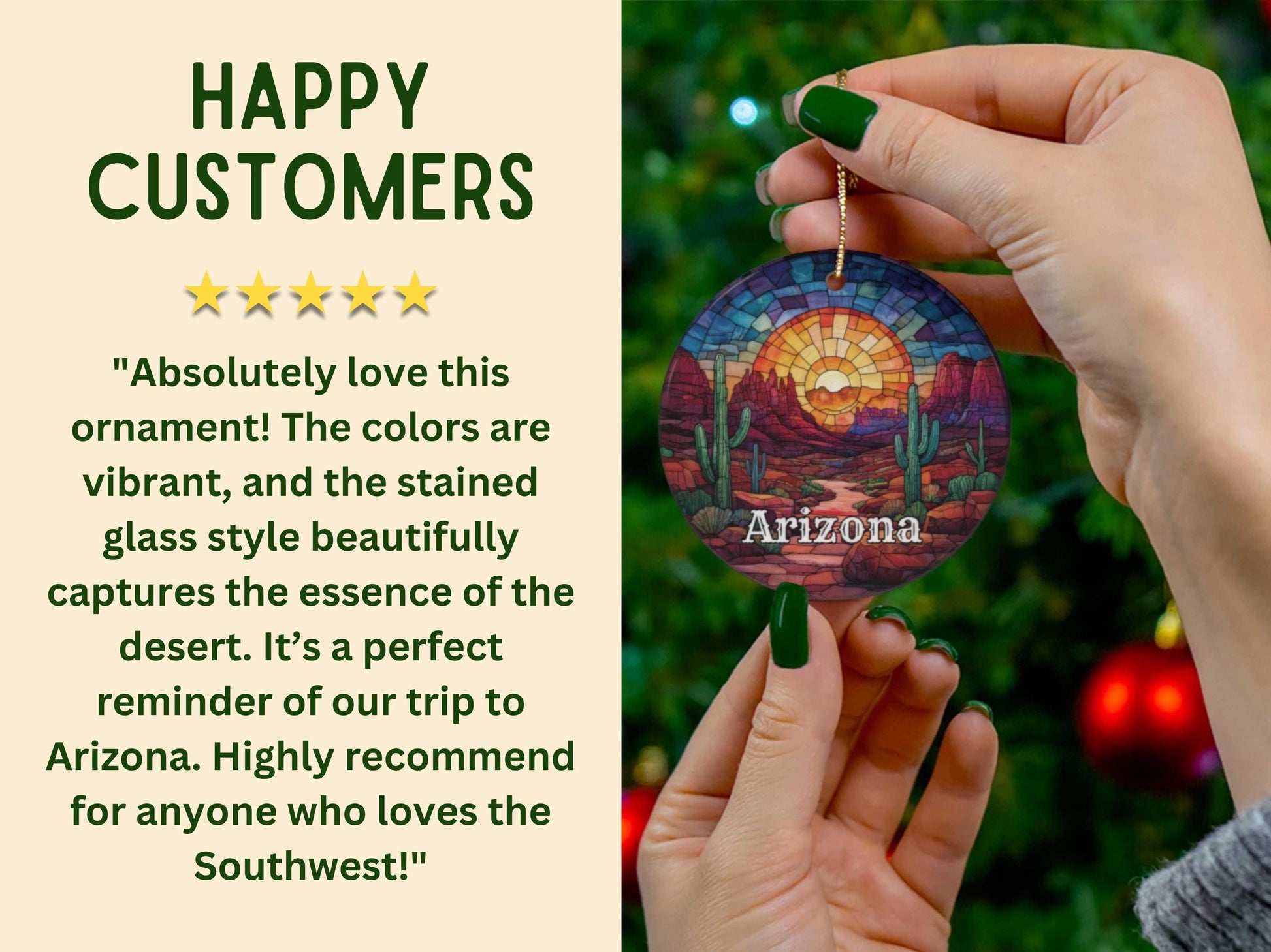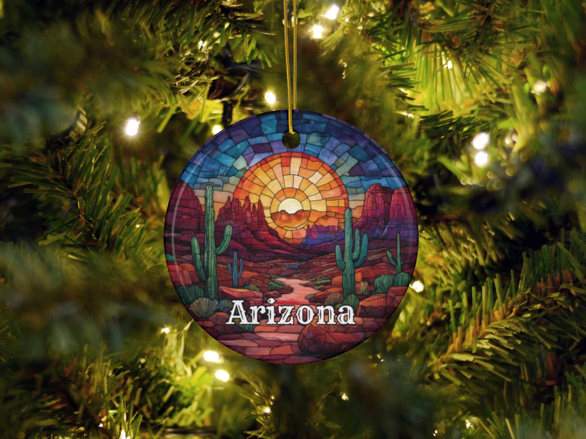 Capture the vibrant beauty of the Arizona desert with this stunning ornament. Showcasing a stained glass-style design of Sedona's iconic red rock formations, towering cacti, and a breathtaking sunset, this ornament brings the spirit of the Southwest to your holiday decor. Perfect for nature lovers, desert enthusiasts, or anyone with a love for Arizona's unique landscape.