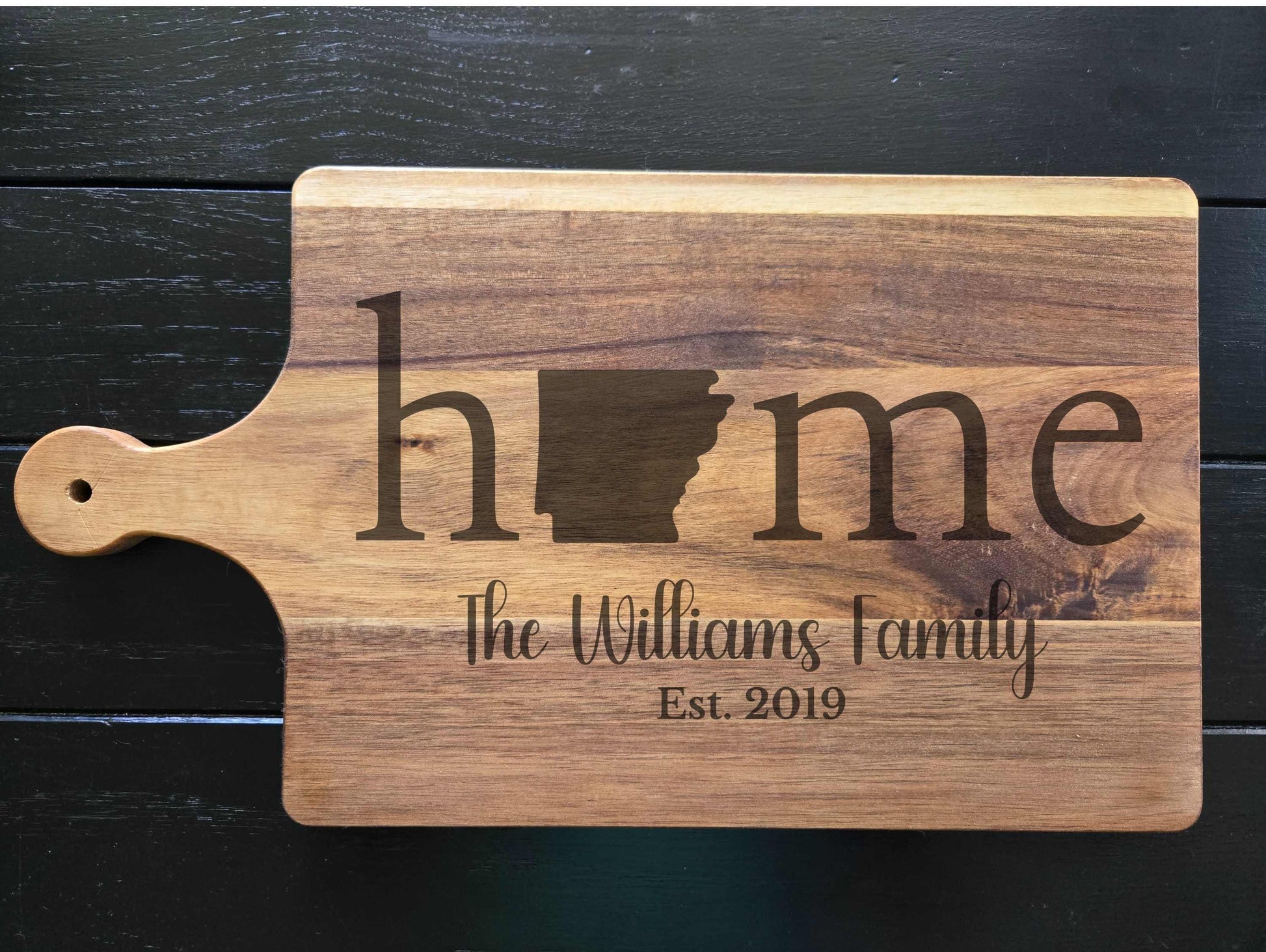 Celebrate your roots or honor a new beginning with our beautifully engraved Arkansas Home cutting board, featuring the shape of Arkansas in place of the "O". This handcrafted acacia wood board makes the perfect personalized gift for weddings, housewarmings, anniversaries, or real estate closings.