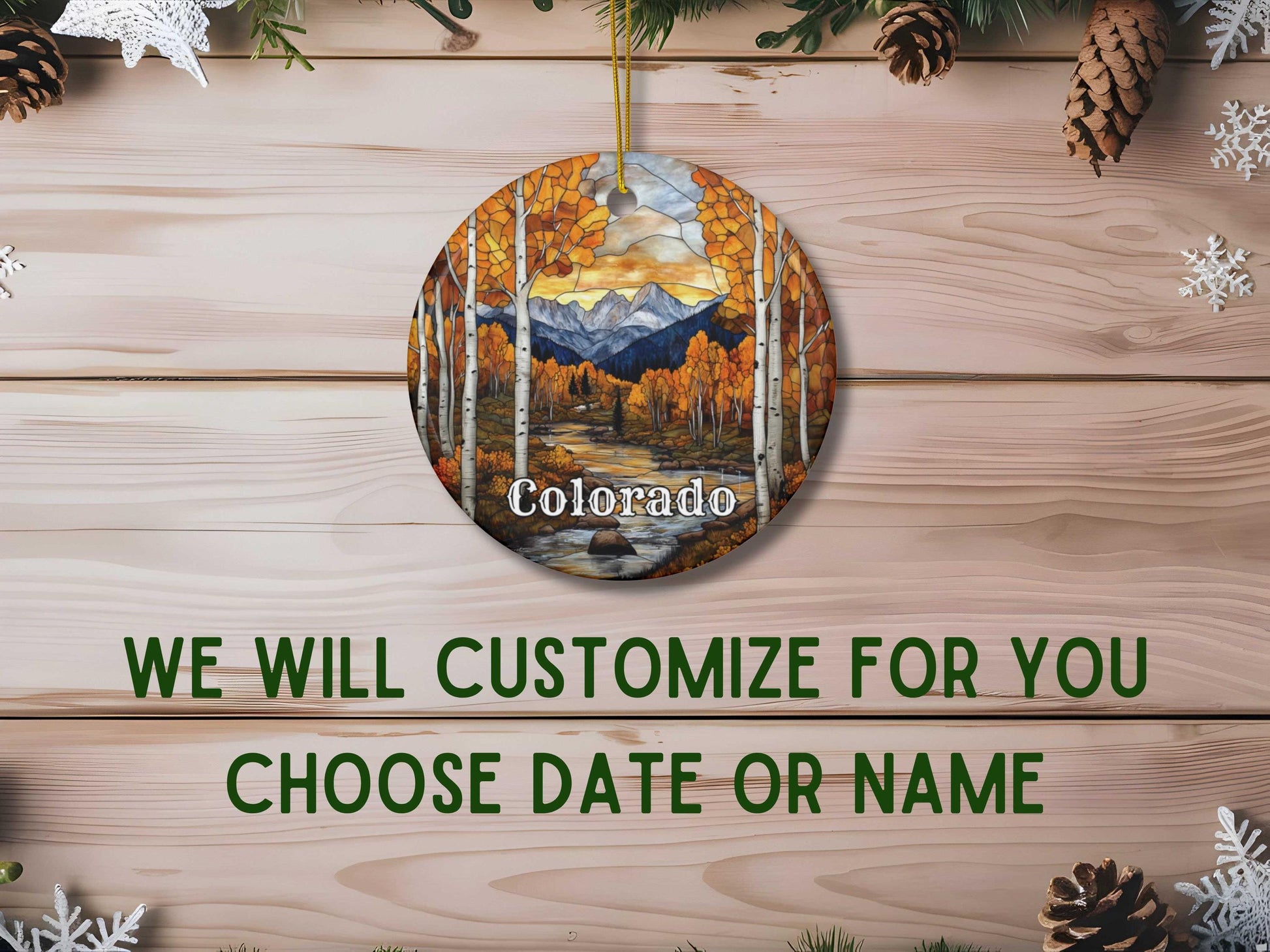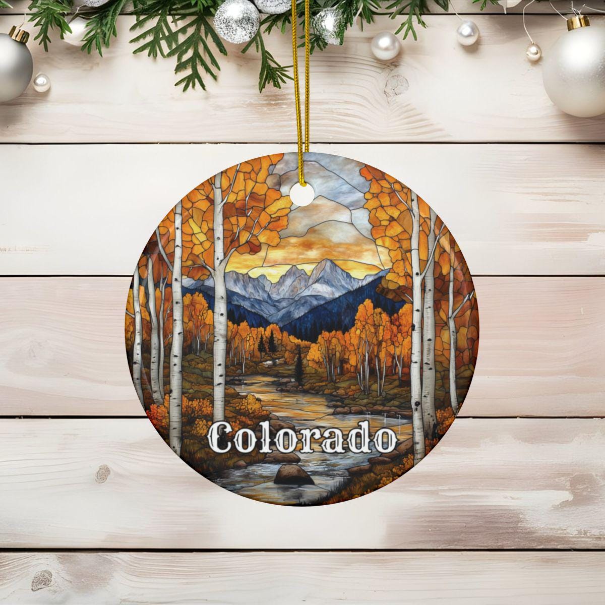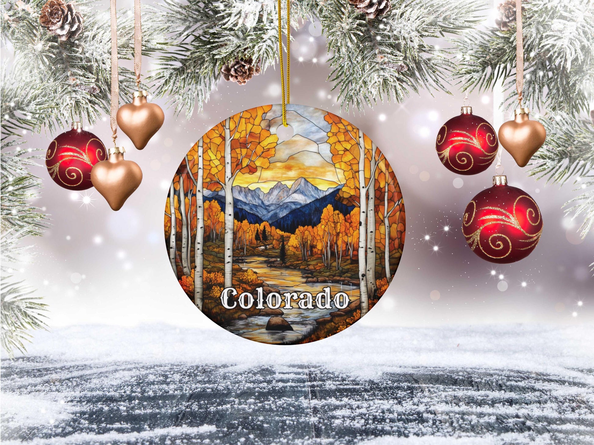 Capture the vibrant beauty of the Colorado Mountains with this stunning stained glass style ornament.