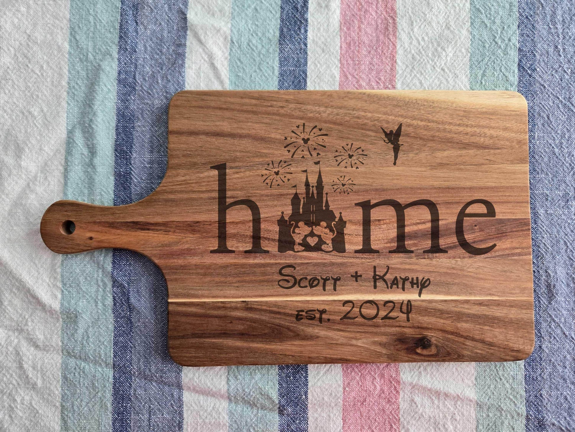 Add a magical touch to your kitchen with our personalized acacia wood cutting board! This beautifully crafted board is laser-engraved with a Mickey & Minnie in the Disney Castle.