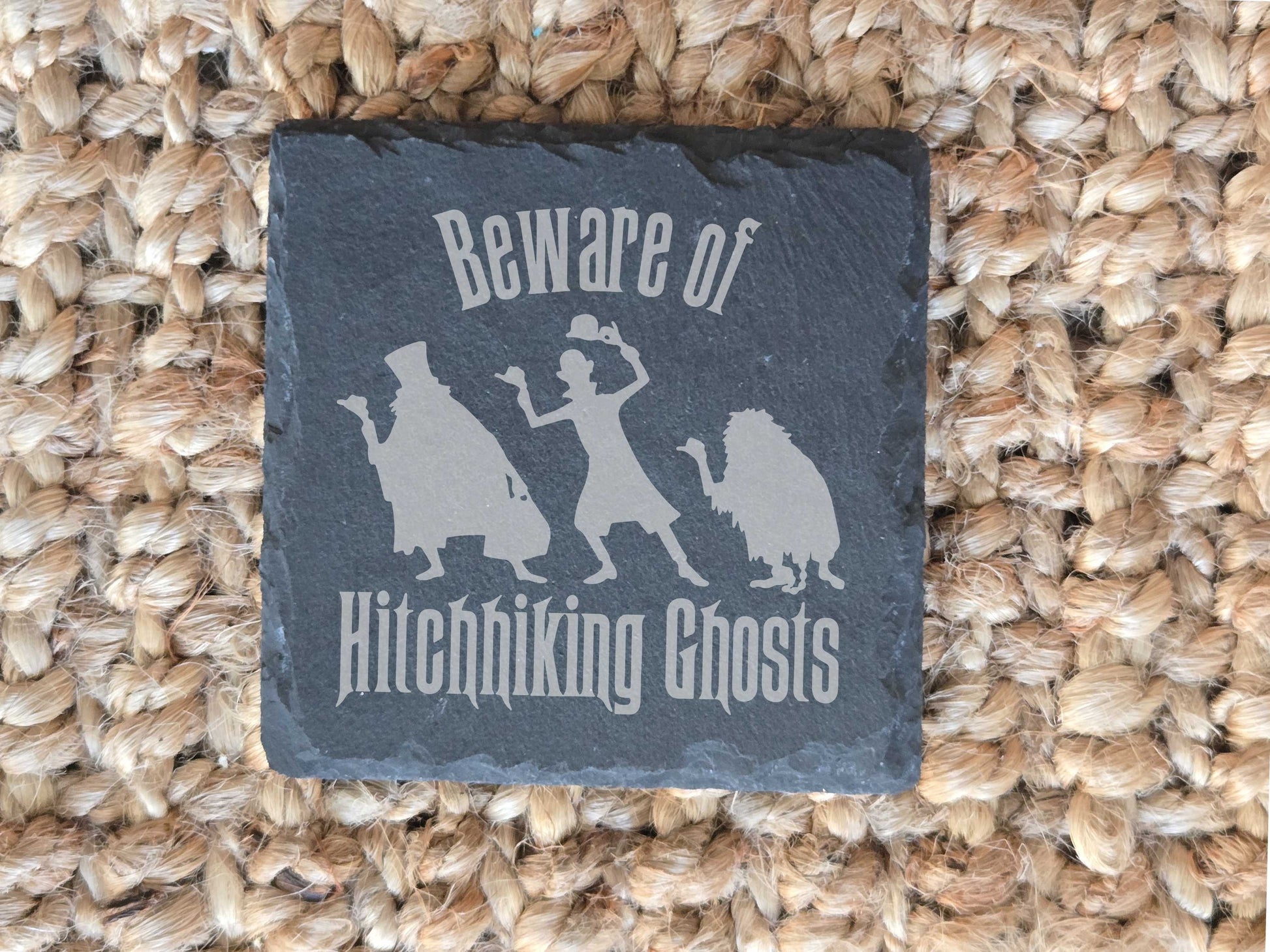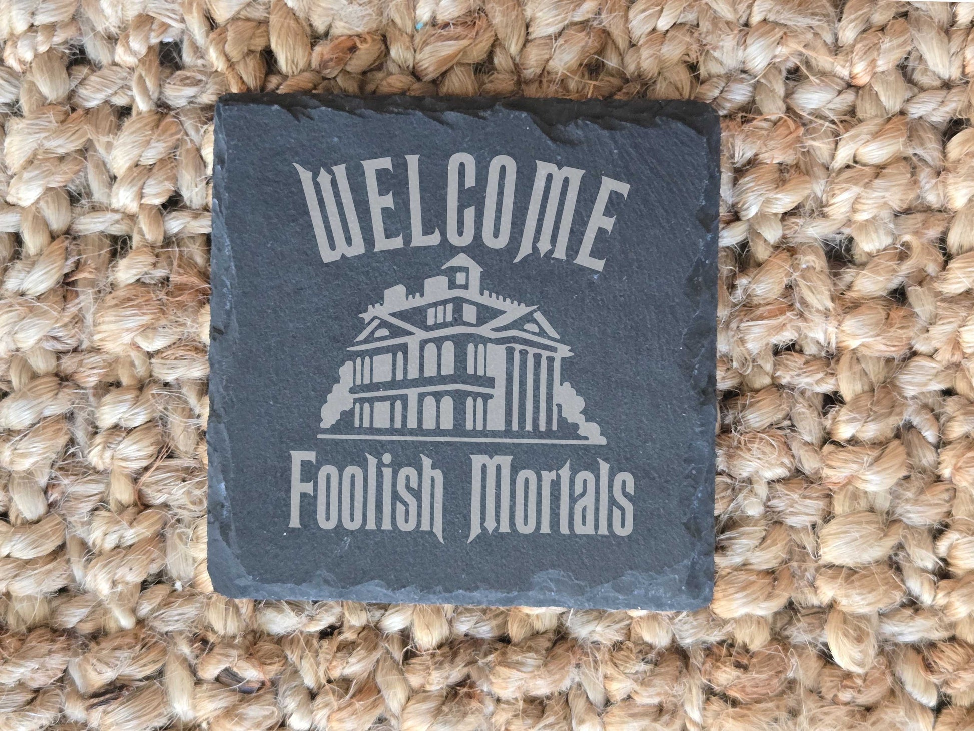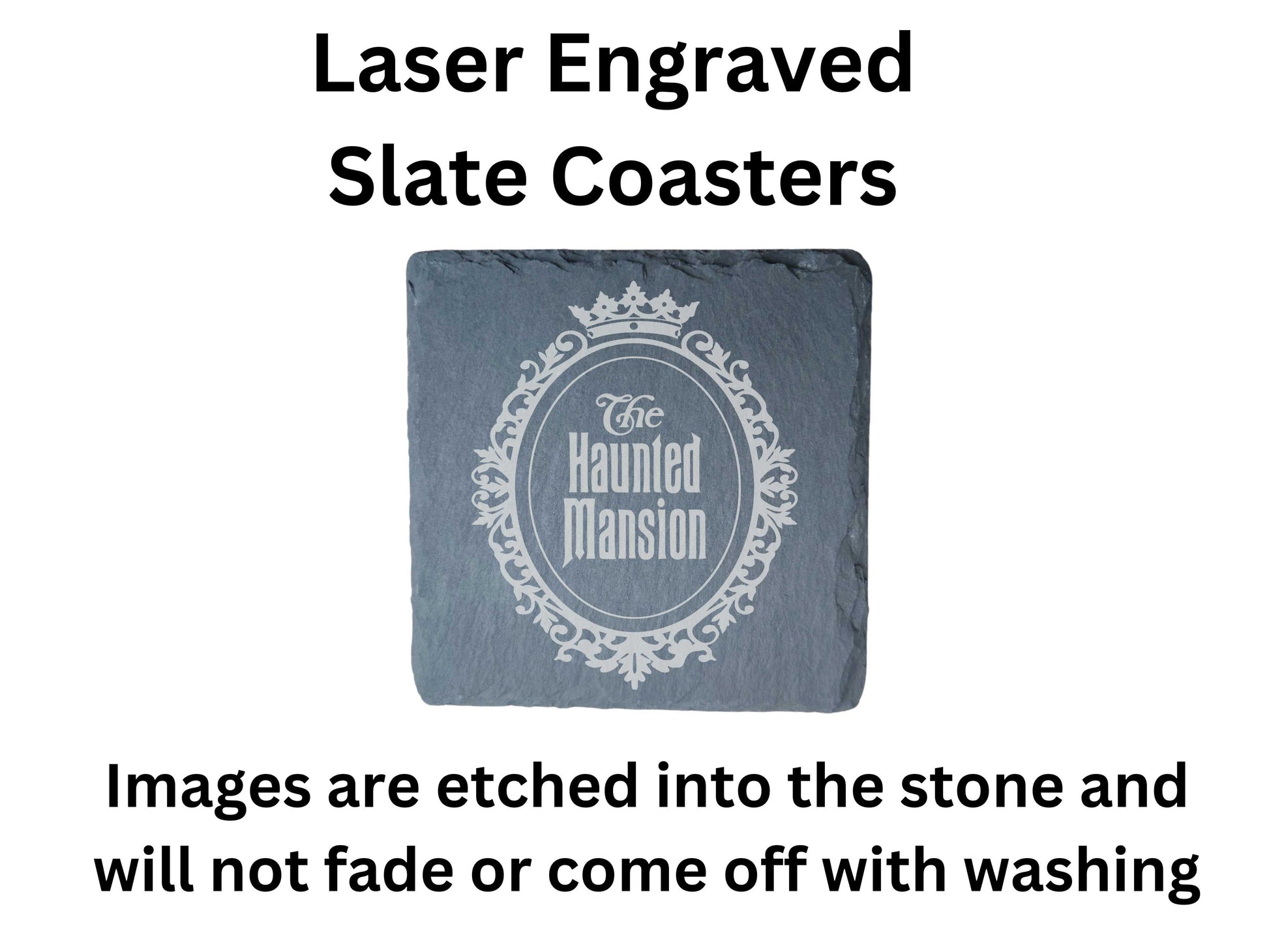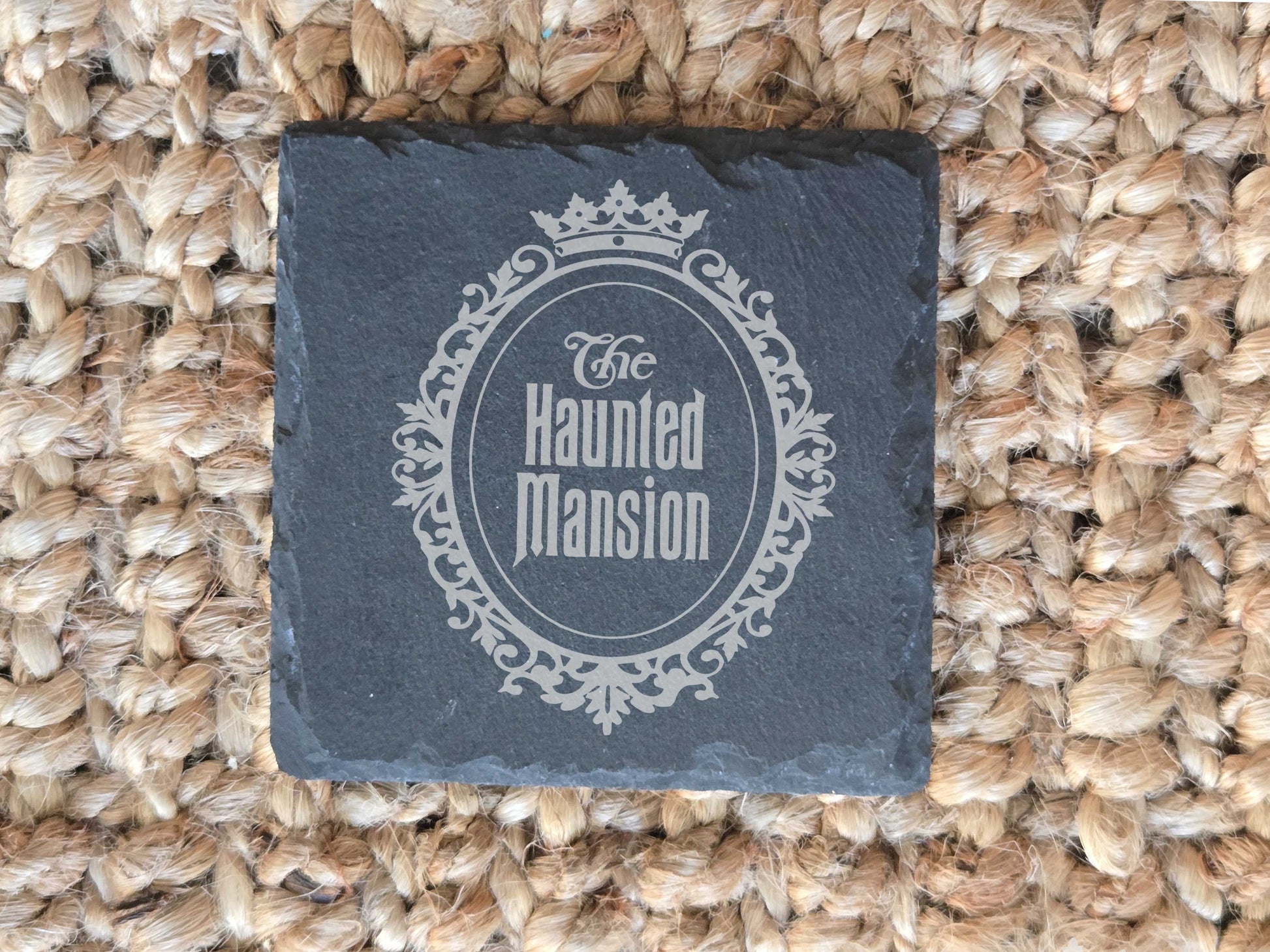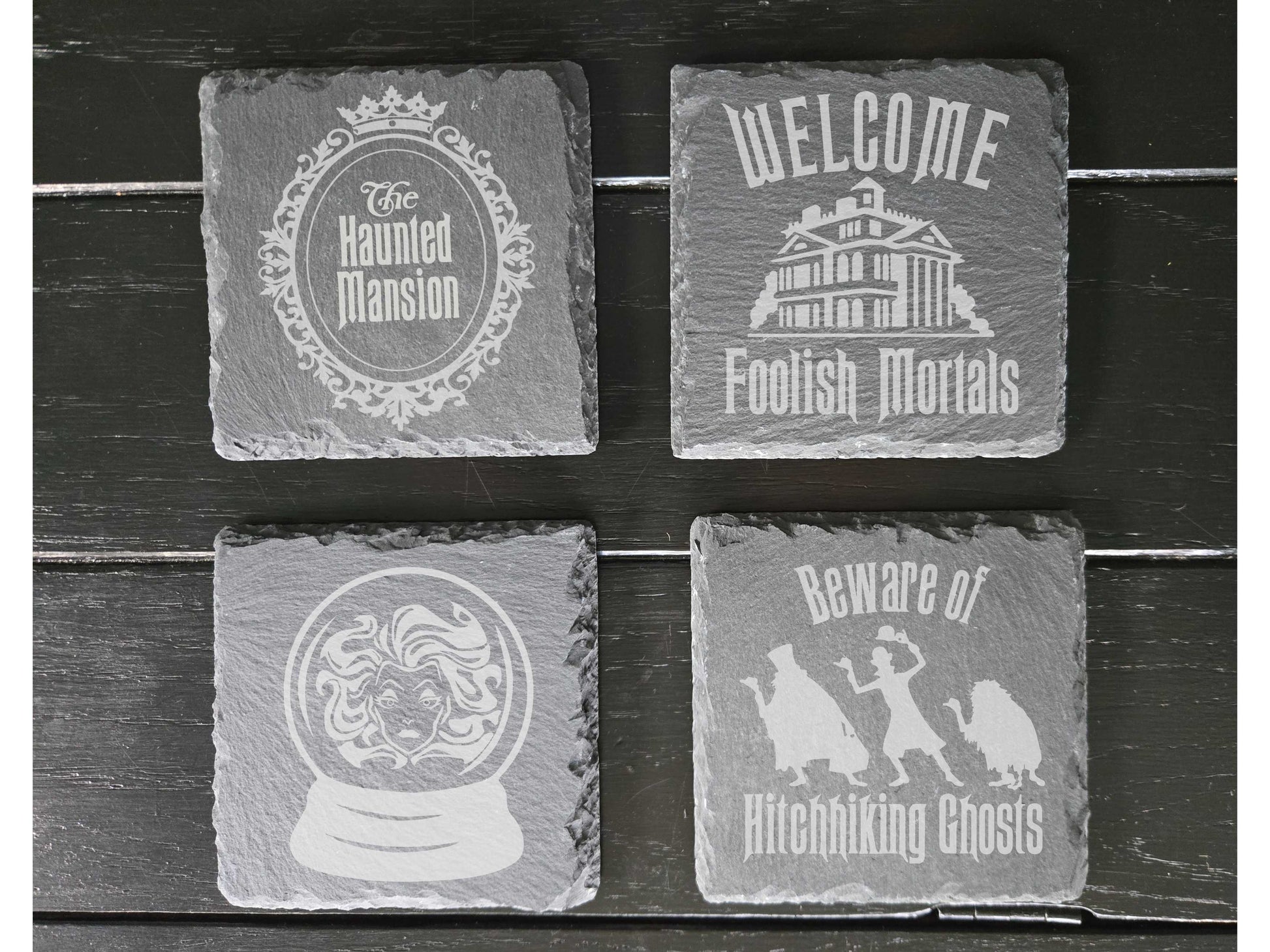 Four engraved Haunted Mansion stone drink coasters! Perfect gift for those who love the Haunted Mansion and Disney theme parks.
