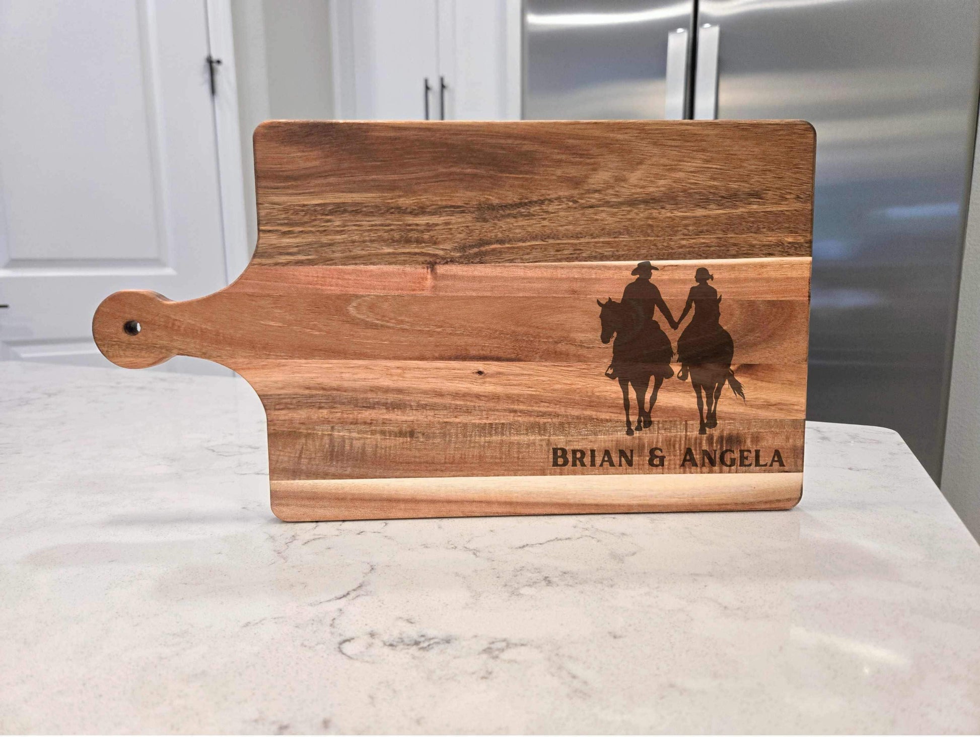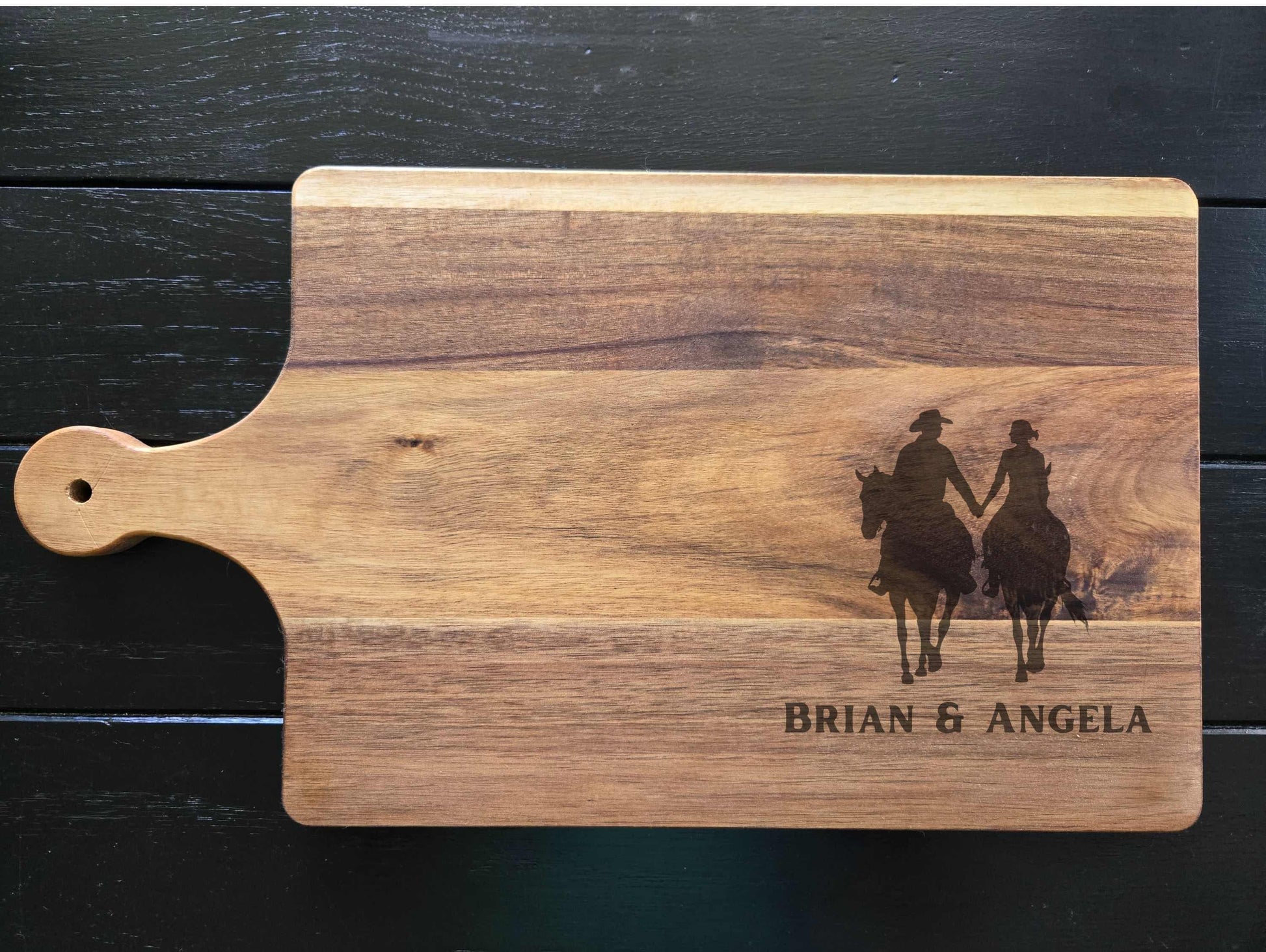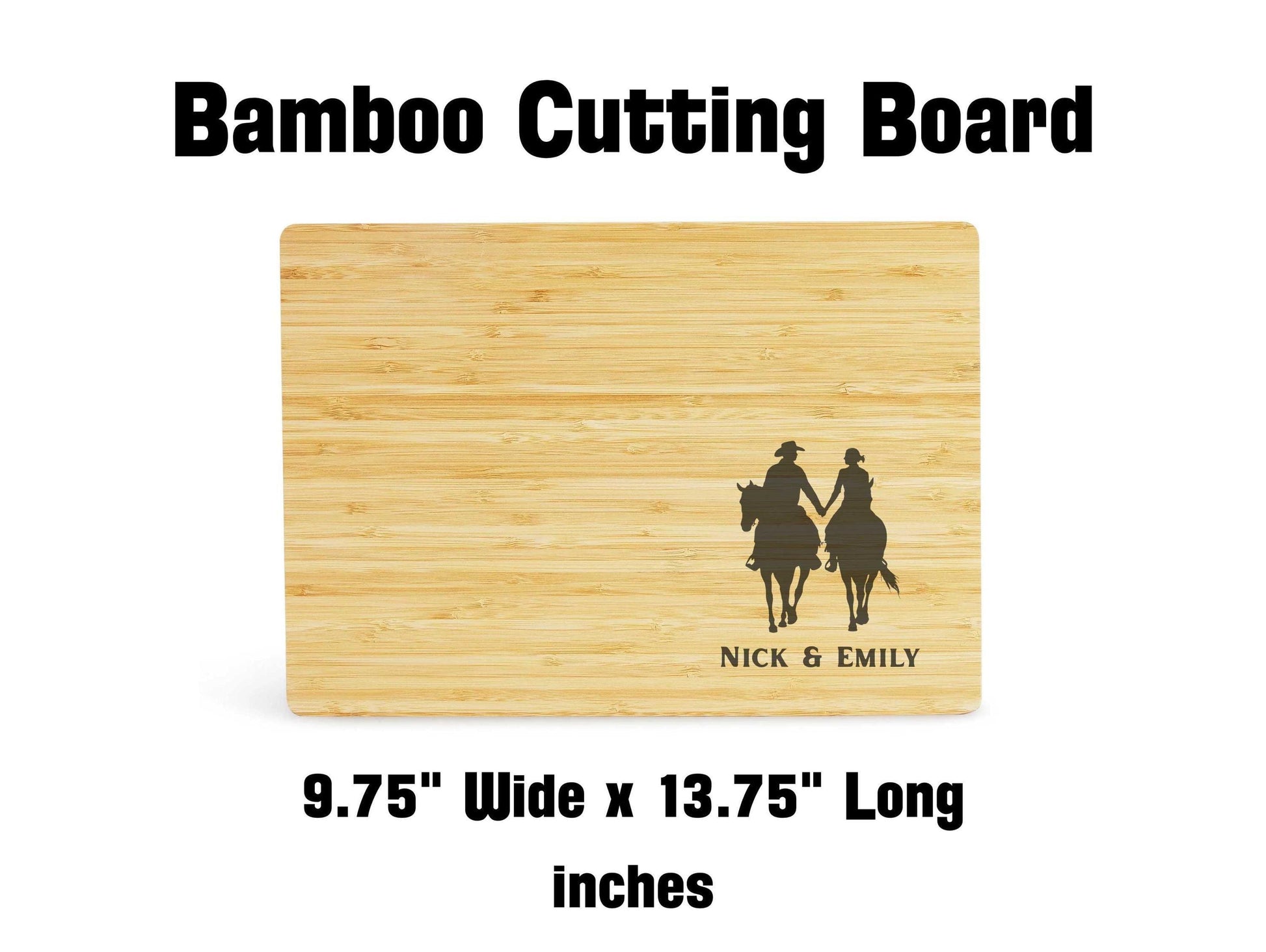Personalized Cowboy & Cowgirl Cutting Board – Beautifully crafted wooden cutting board featuring a romantic silhouette of a couple on horseback, custom engraved with your names. Perfect for weddings, anniversaries, housewarmings, or as rustic farmhouse kitchen décor.