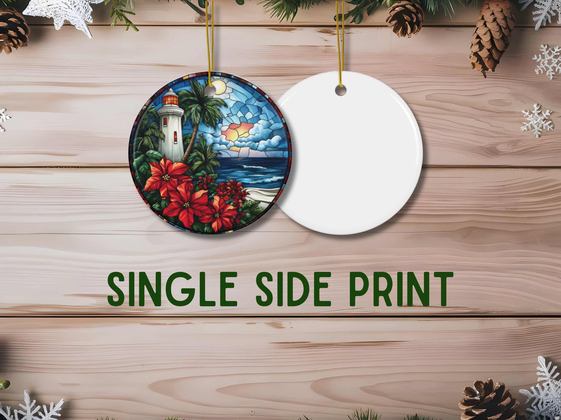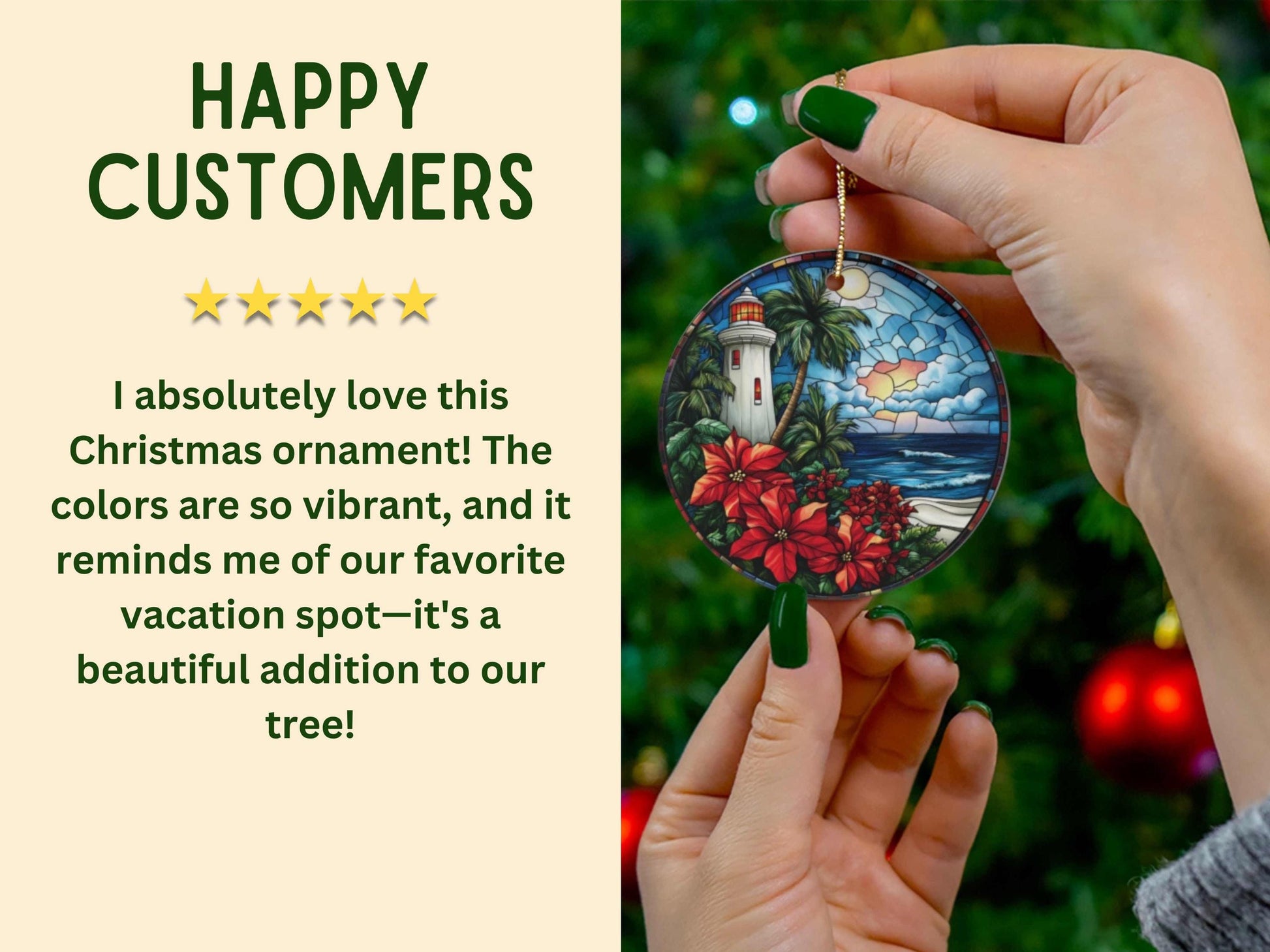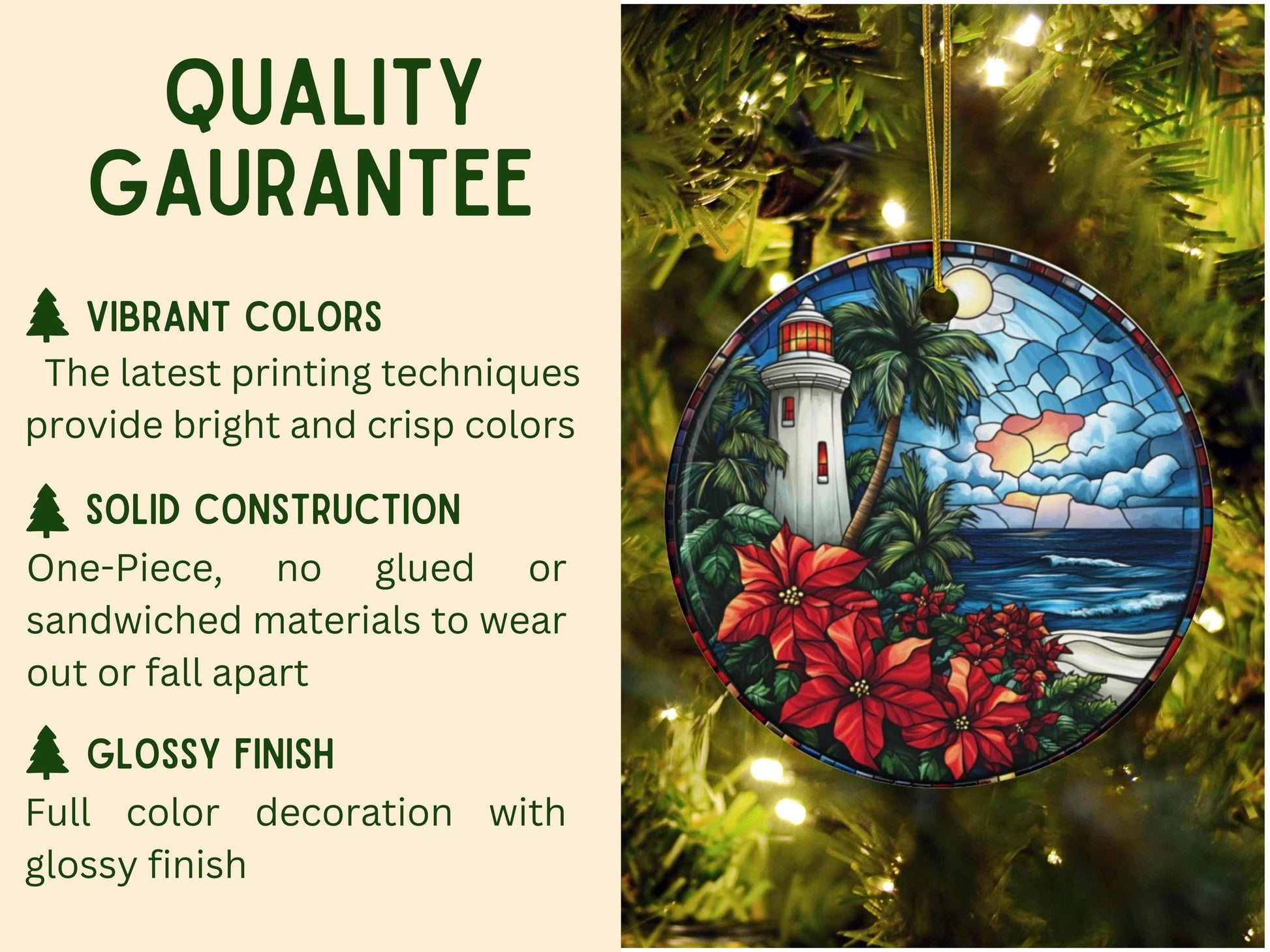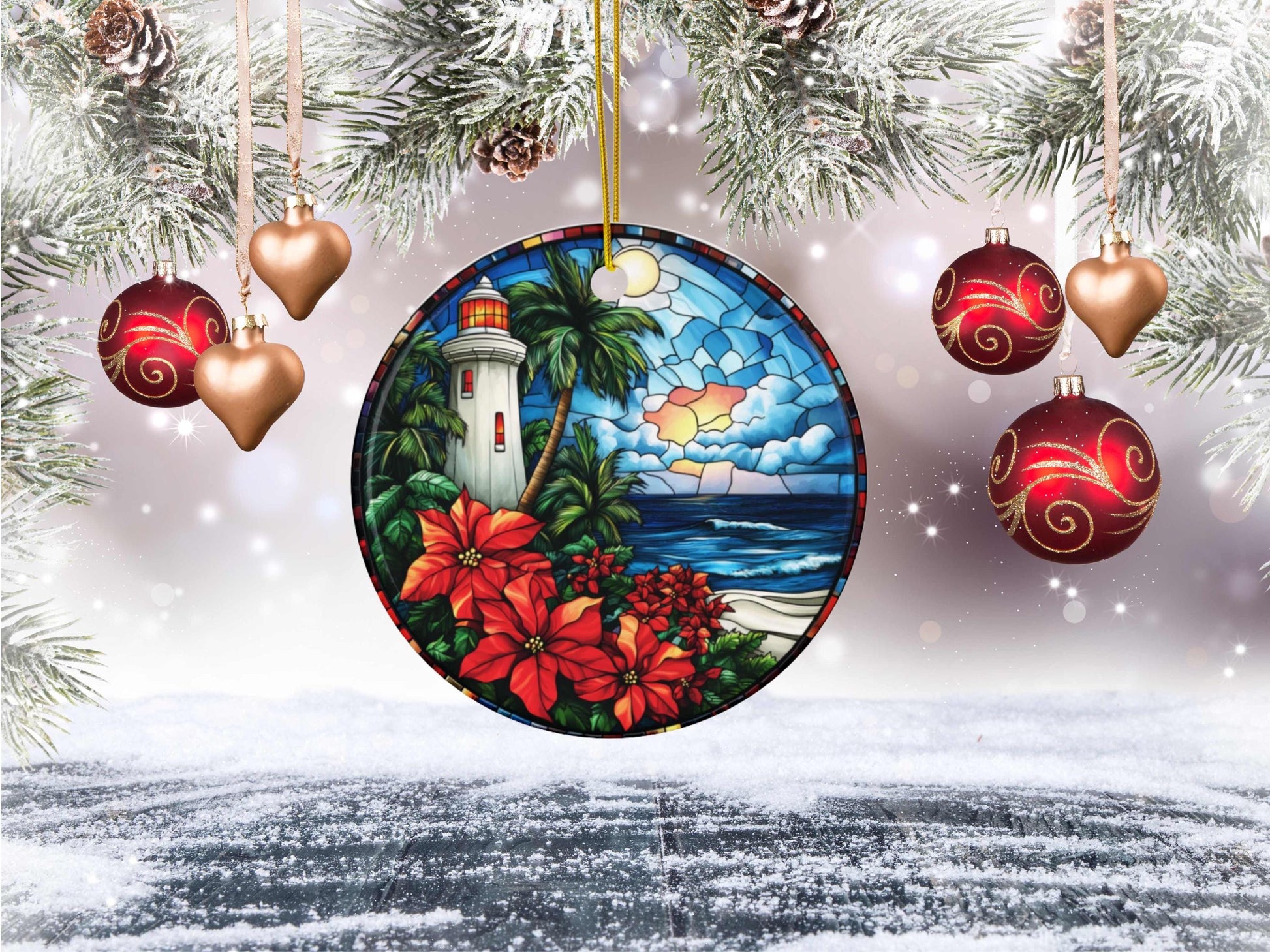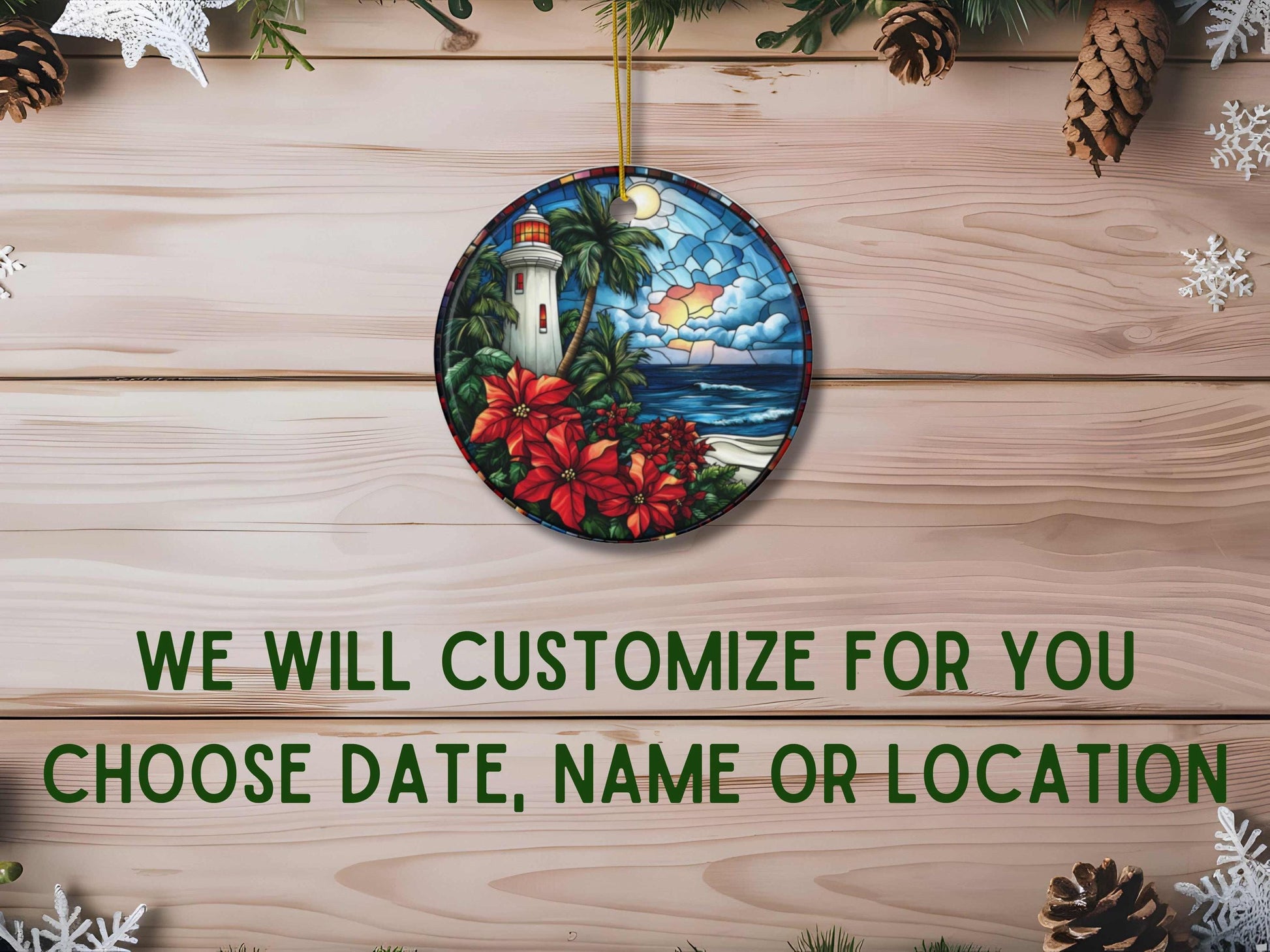 This Lighthouse Christmas Ornament features a picturesque lighthouse, the ocean and Poinsettia Flowers, bringing a touch of coastal charm to your holiday decorations. Your ornament can be personalized with names and dates or a specific location. Just let us know what you would like printed on the ornament. Perfect for adding a touch of tropical paradise to your holiday decor or as a gift for beach lovers.