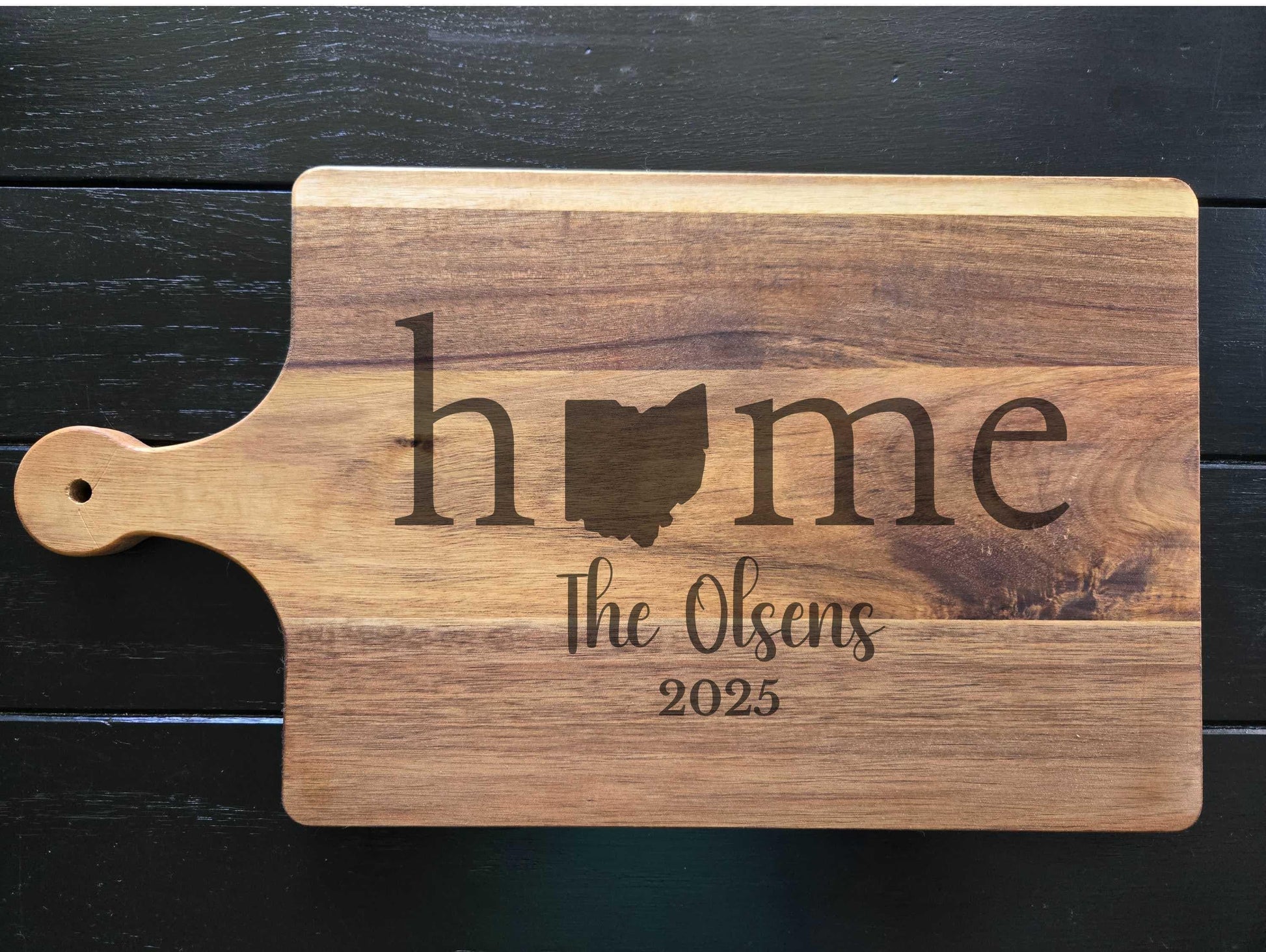 Celebrate your roots or honor a new beginning with our beautifully engraved Ohio Home cutting board, featuring the shape of Ohio in place of the "O". This handcrafted acacia wood board makes the perfect personalized gift for weddings, housewarmings, anniversaries, or real estate closings.