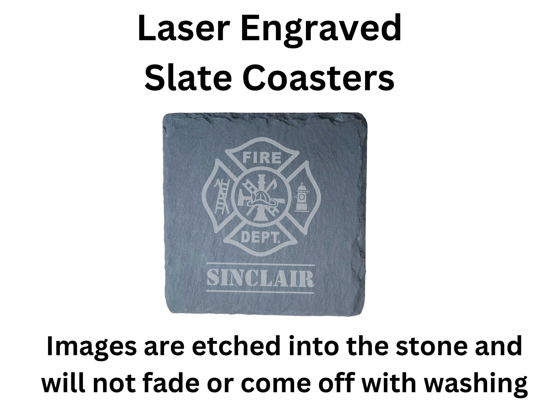 Honor the bravery of firefighters with this personalized engraved slate coaster featuring the classic Fire Department Maltese cross design. Customizable with a name, rank, or department.