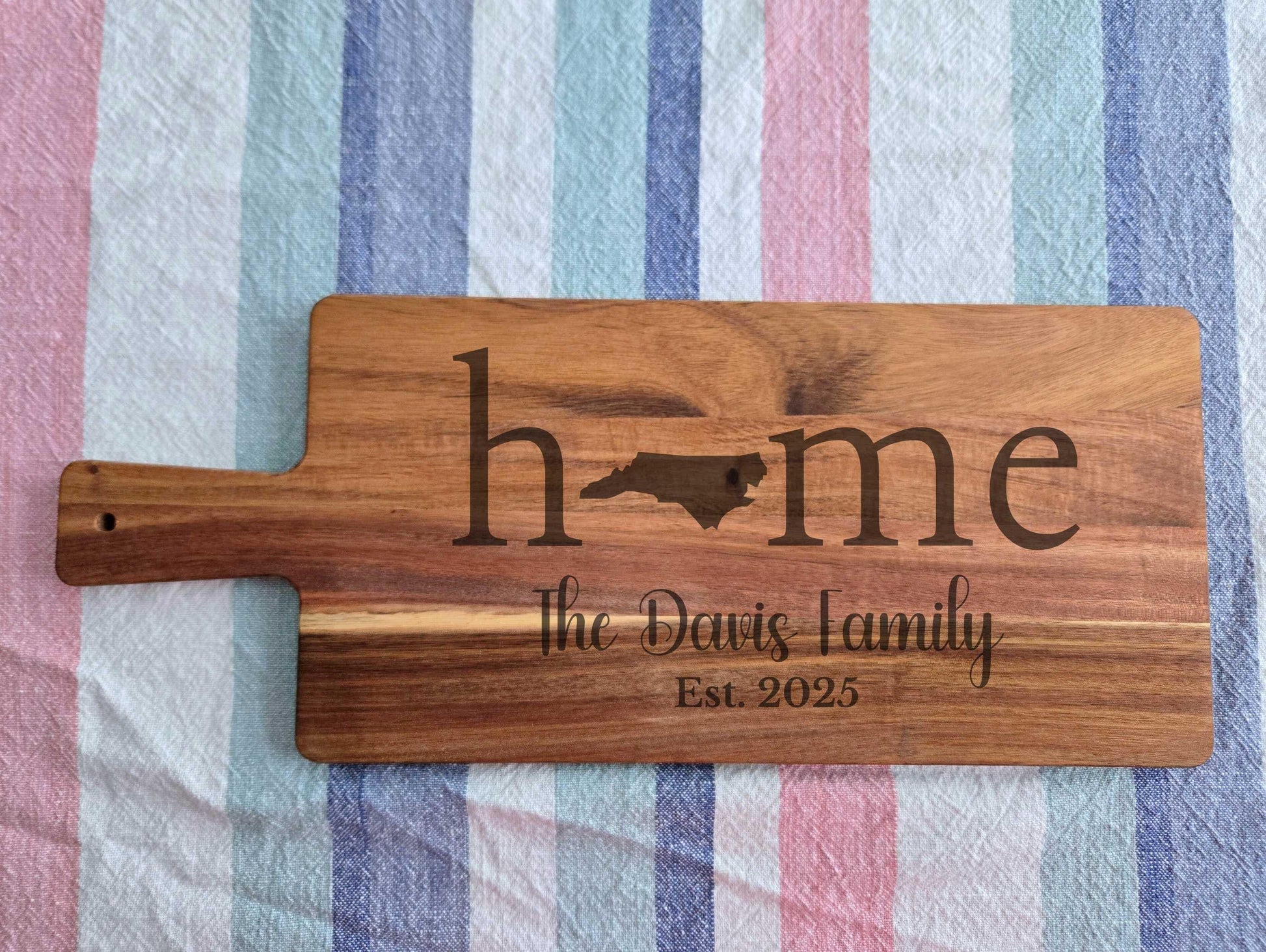 Celebrate your roots or honor a new beginning with our beautifully engraved North Carolina Home cutting board, featuring the shape of North Carolina in place of the "O". This handcrafted cutting board makes the perfect personalized gift for weddings, housewarmings, anniversaries, or real estate closings.