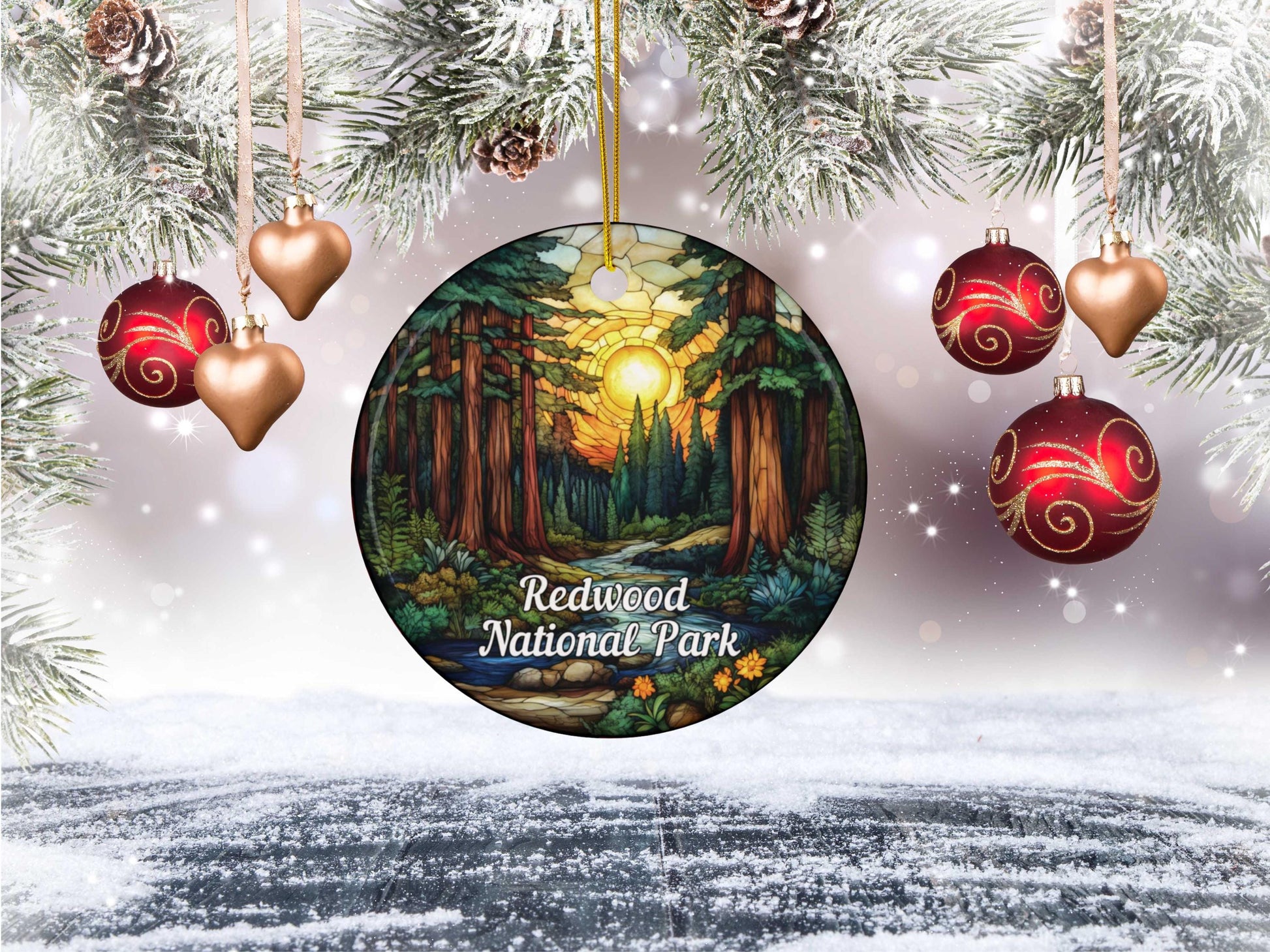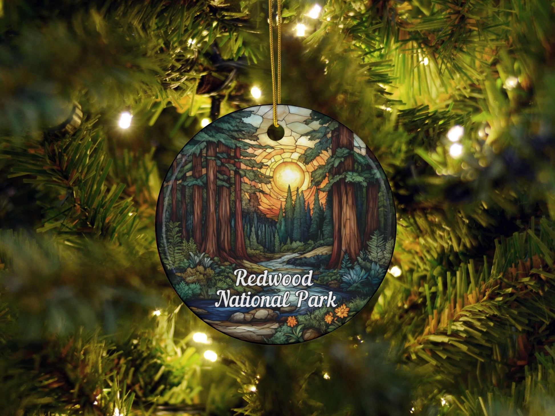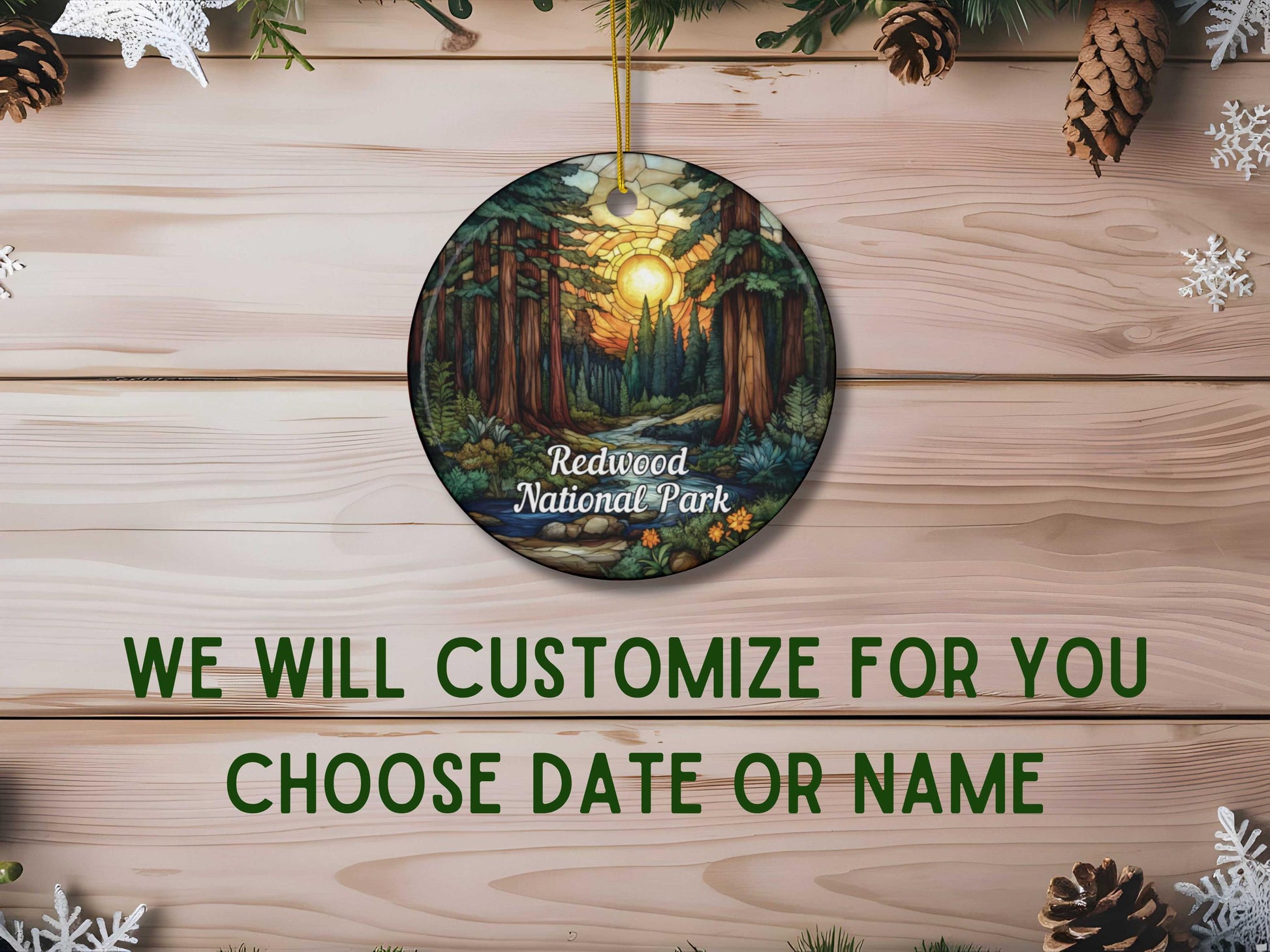 Bring the majestic beauty of Redwood National Park into your home with this stunning ornament. Featuring towering redwoods and a serene sunset in stained glass style, it's the perfect keepsake for nature lovers and anyone captivated by California's iconic forests.We will personalize for you. Just let us know what you would like printed on your ornament.