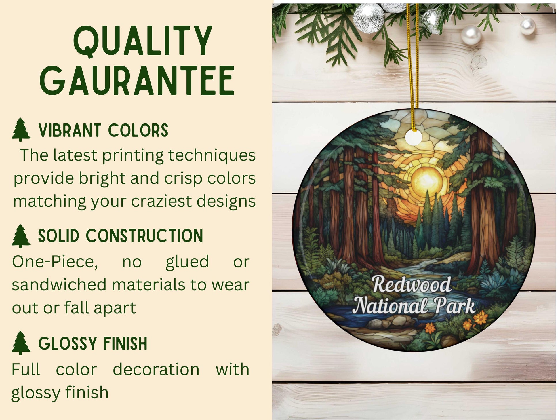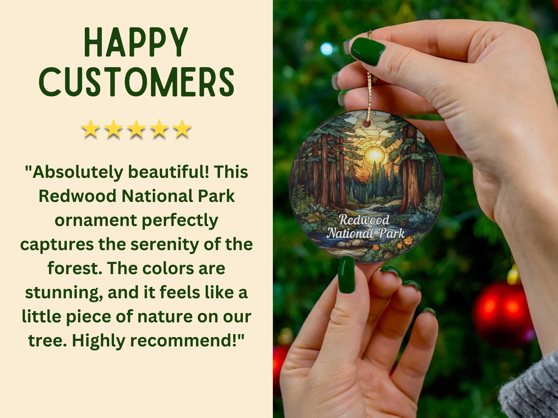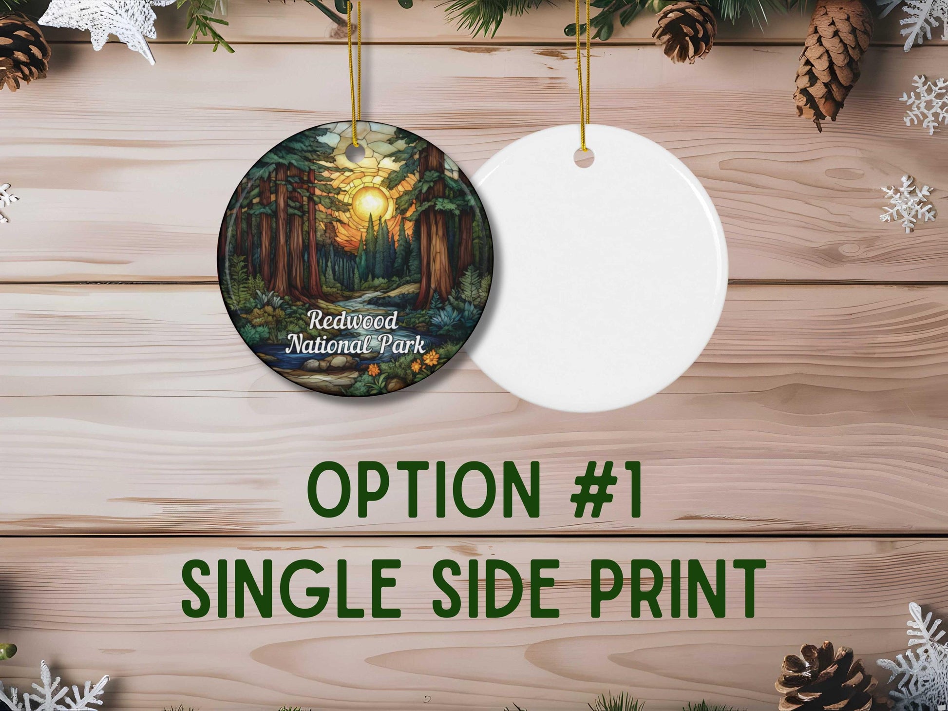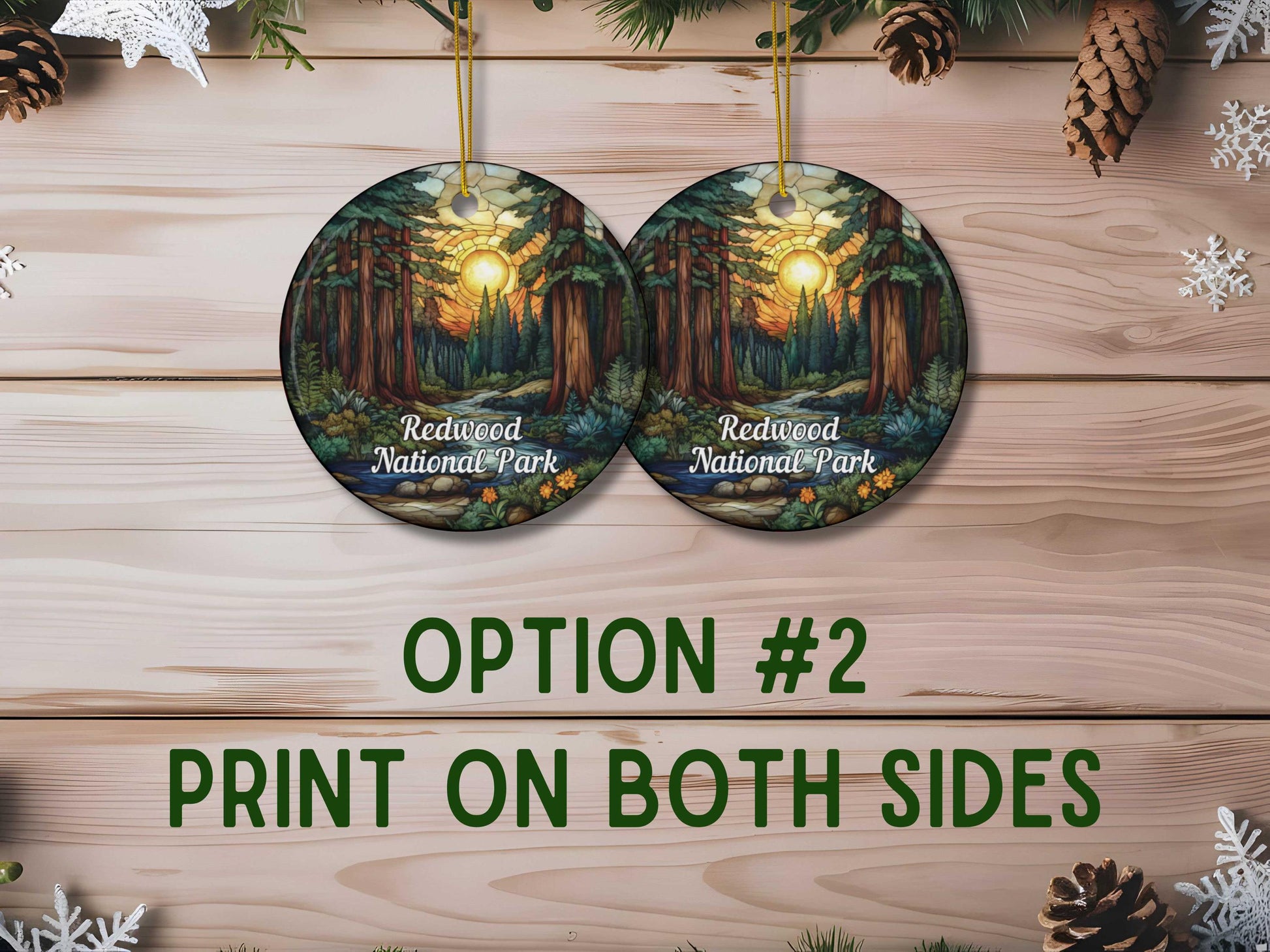 Bring the majestic beauty of Redwood National Park into your home with this stunning ornament. Featuring towering redwoods and a serene sunset in stained glass style, it's the perfect keepsake for nature lovers and anyone captivated by California's iconic forests.We will personalize for you. Just let us know what you would like printed on your ornament.