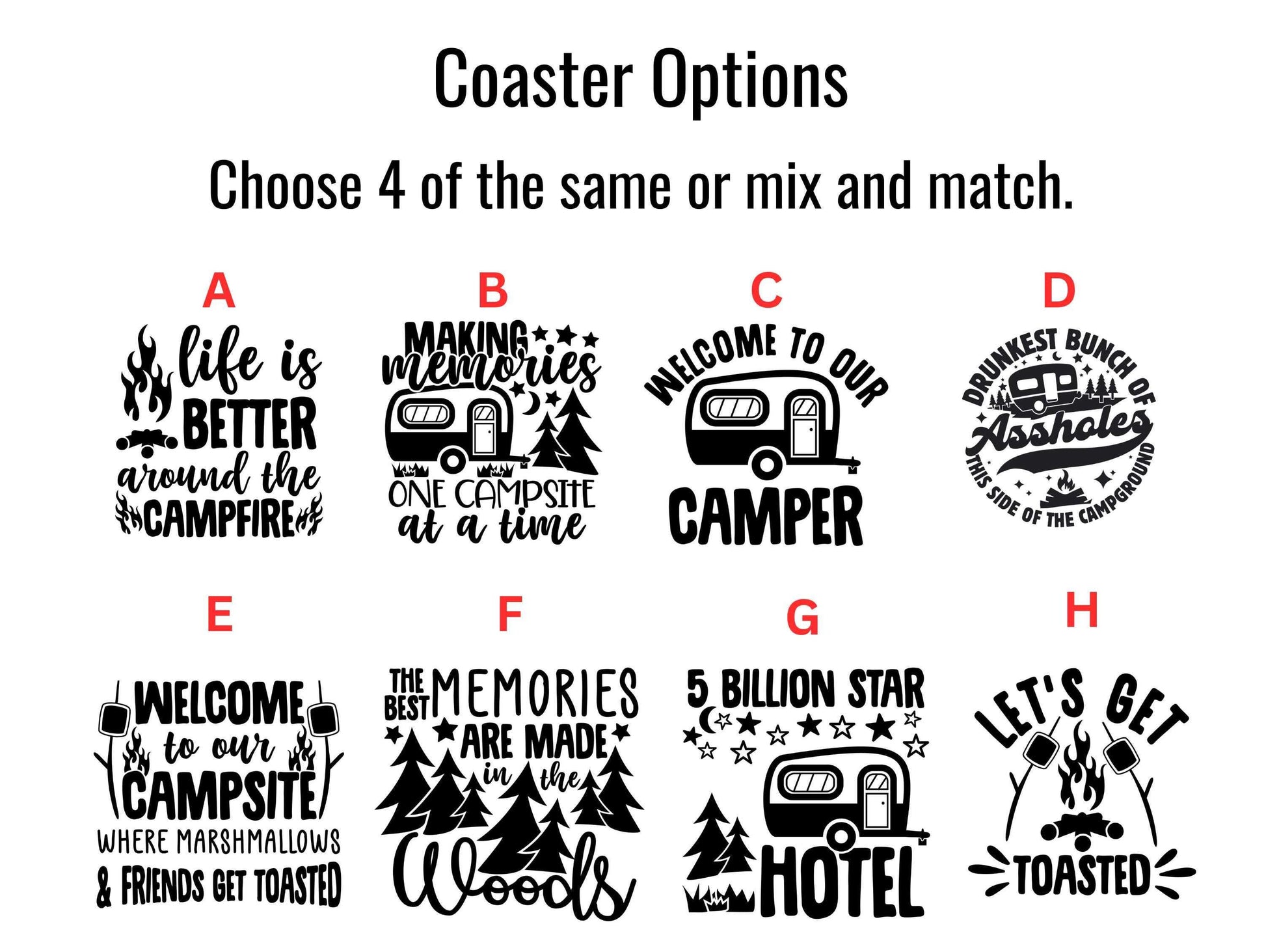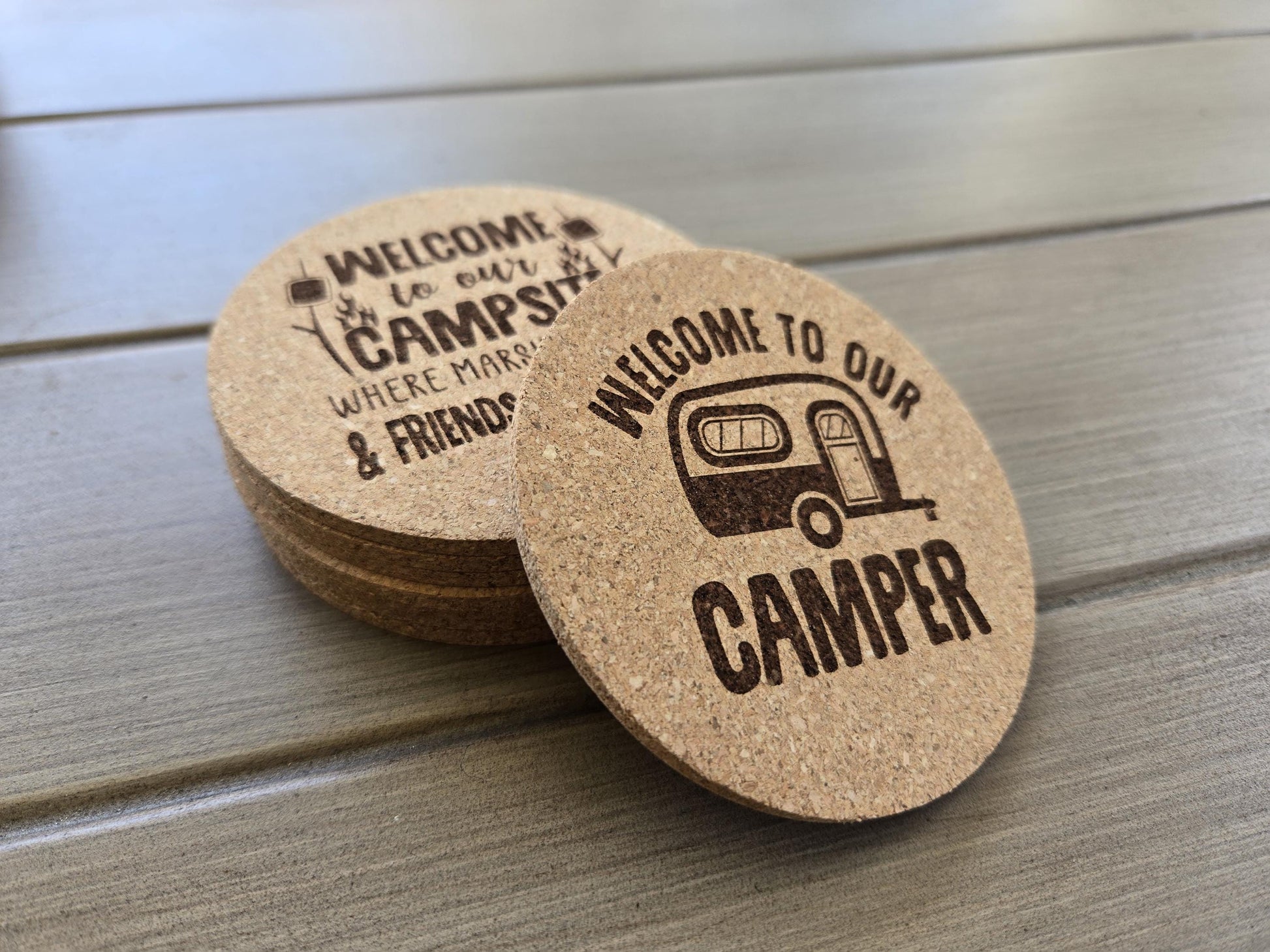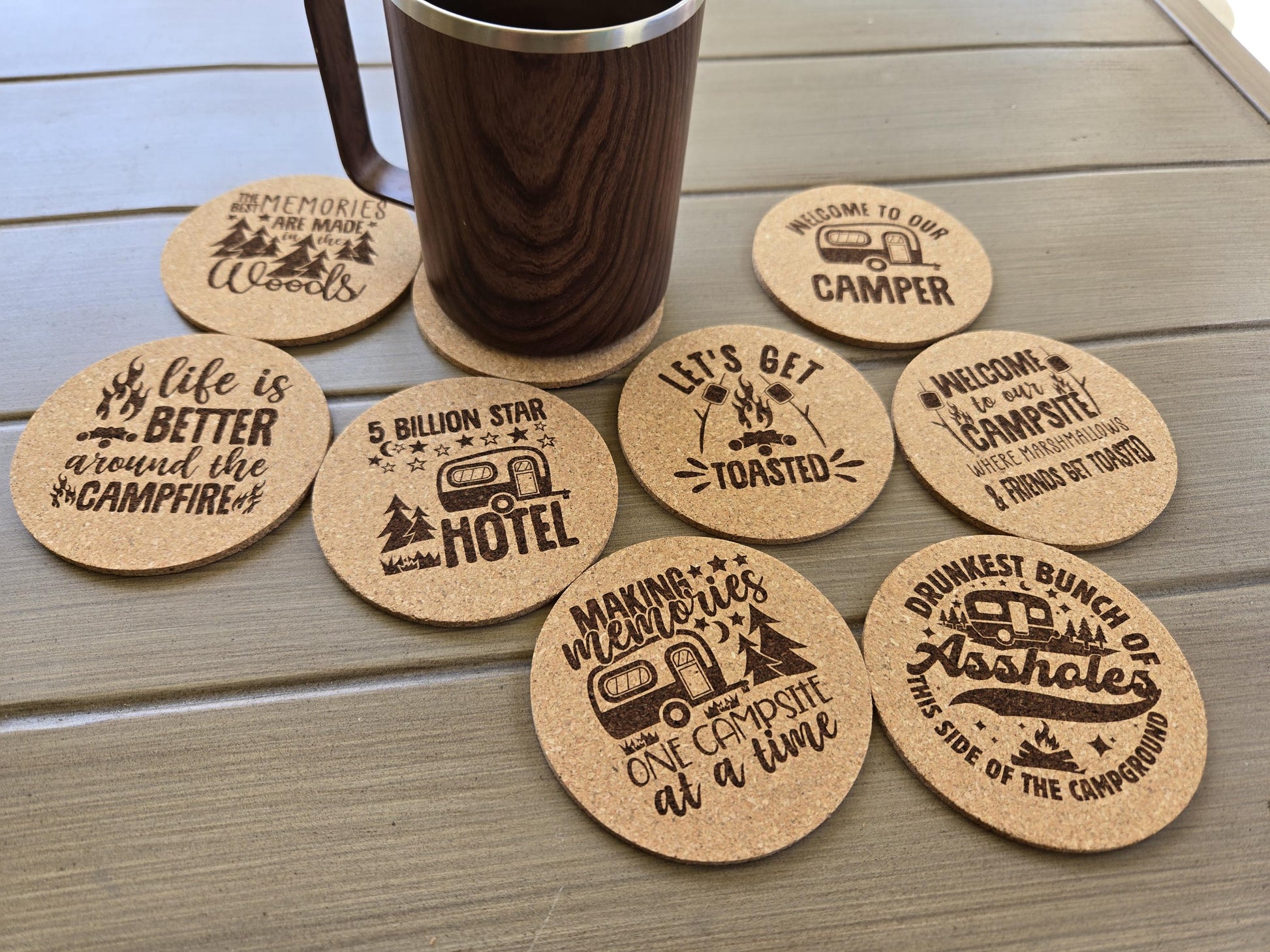 These fun cork camping coasters are perfect for outdoor lovers! Choose any 4 from 8 humorous designs. Great for RVs, campsites, or as a unique camper gift. Made from eco-friendly cork to protect surfaces while adding a rustic touch to your adventures!