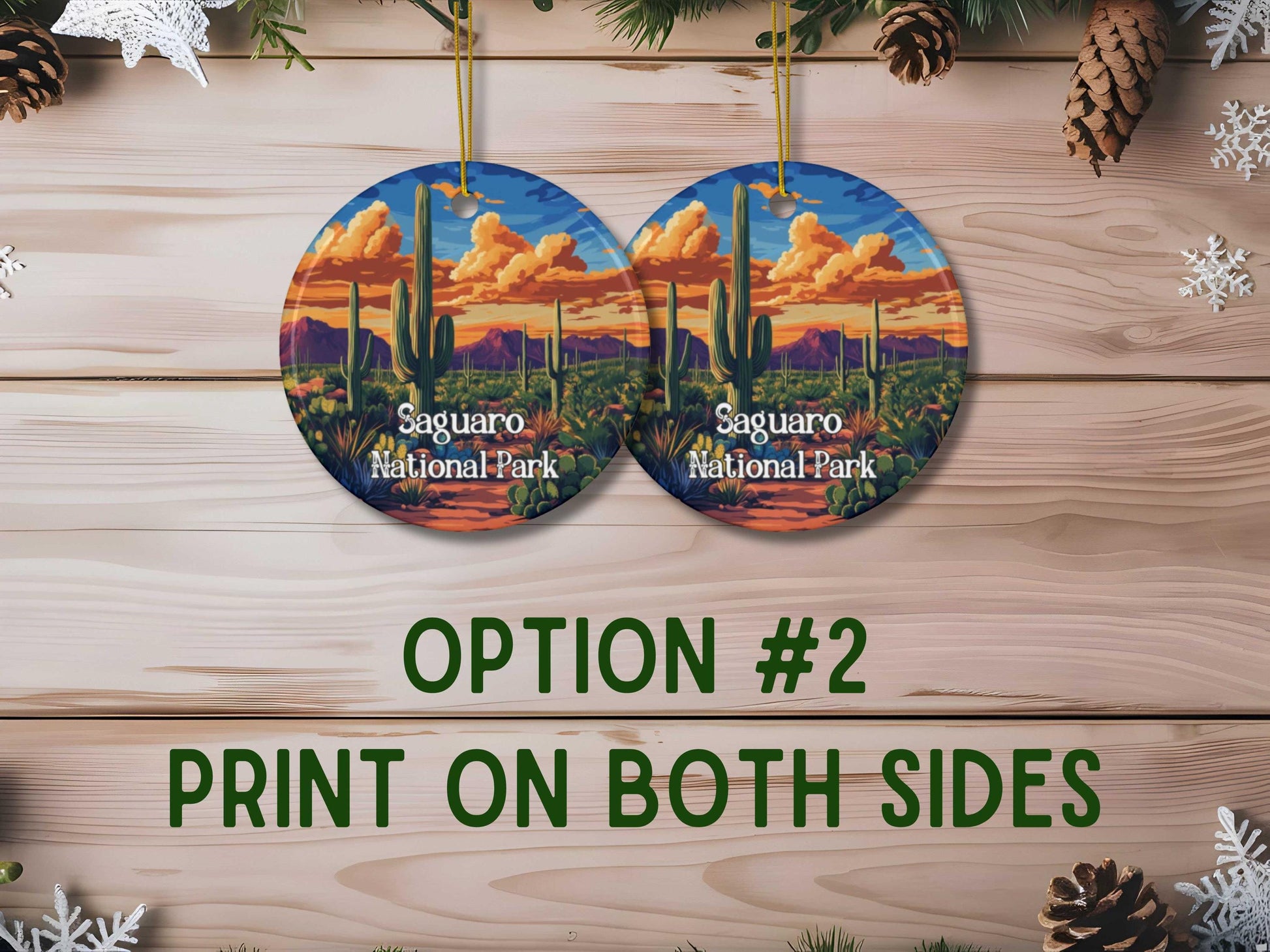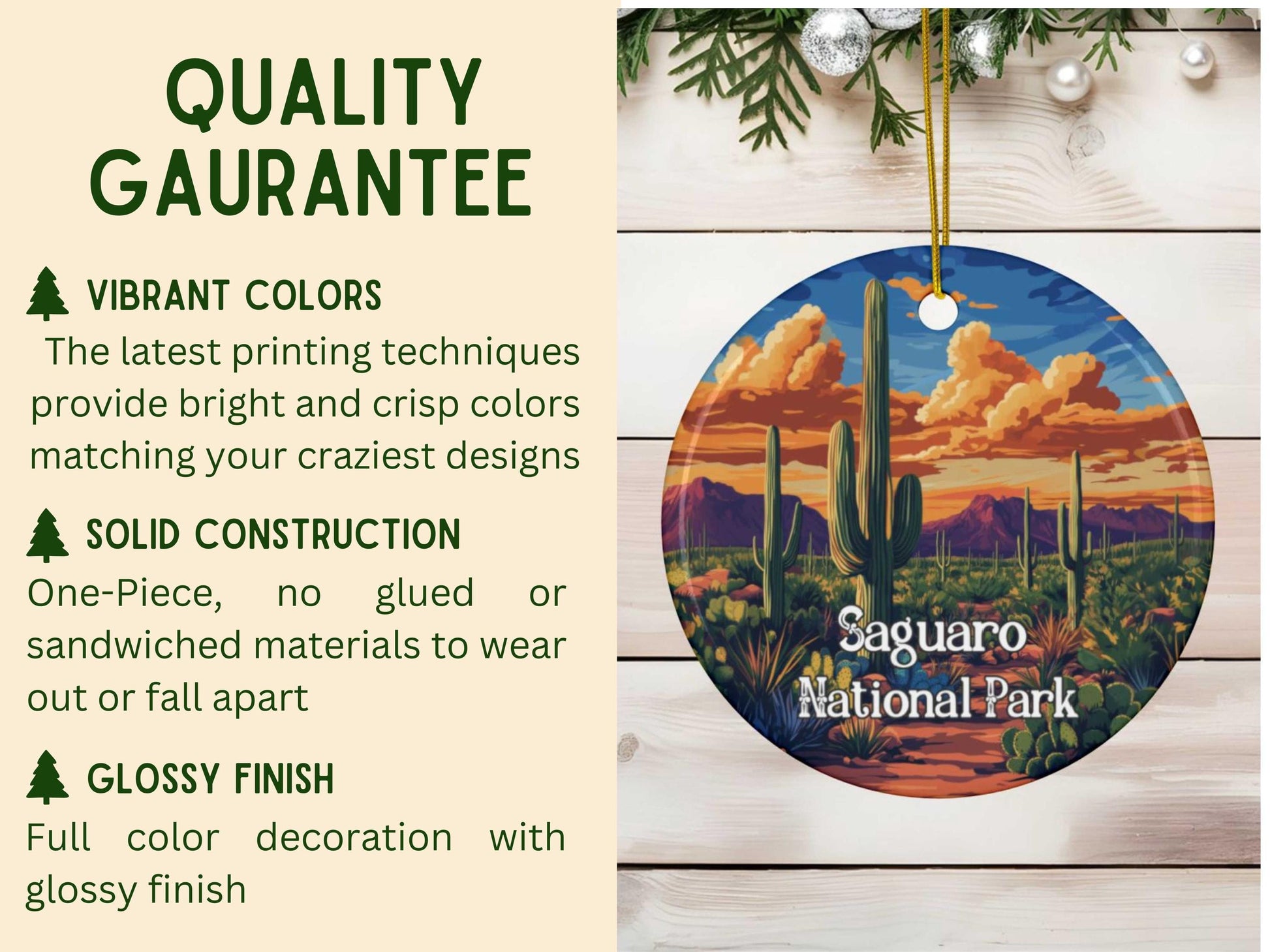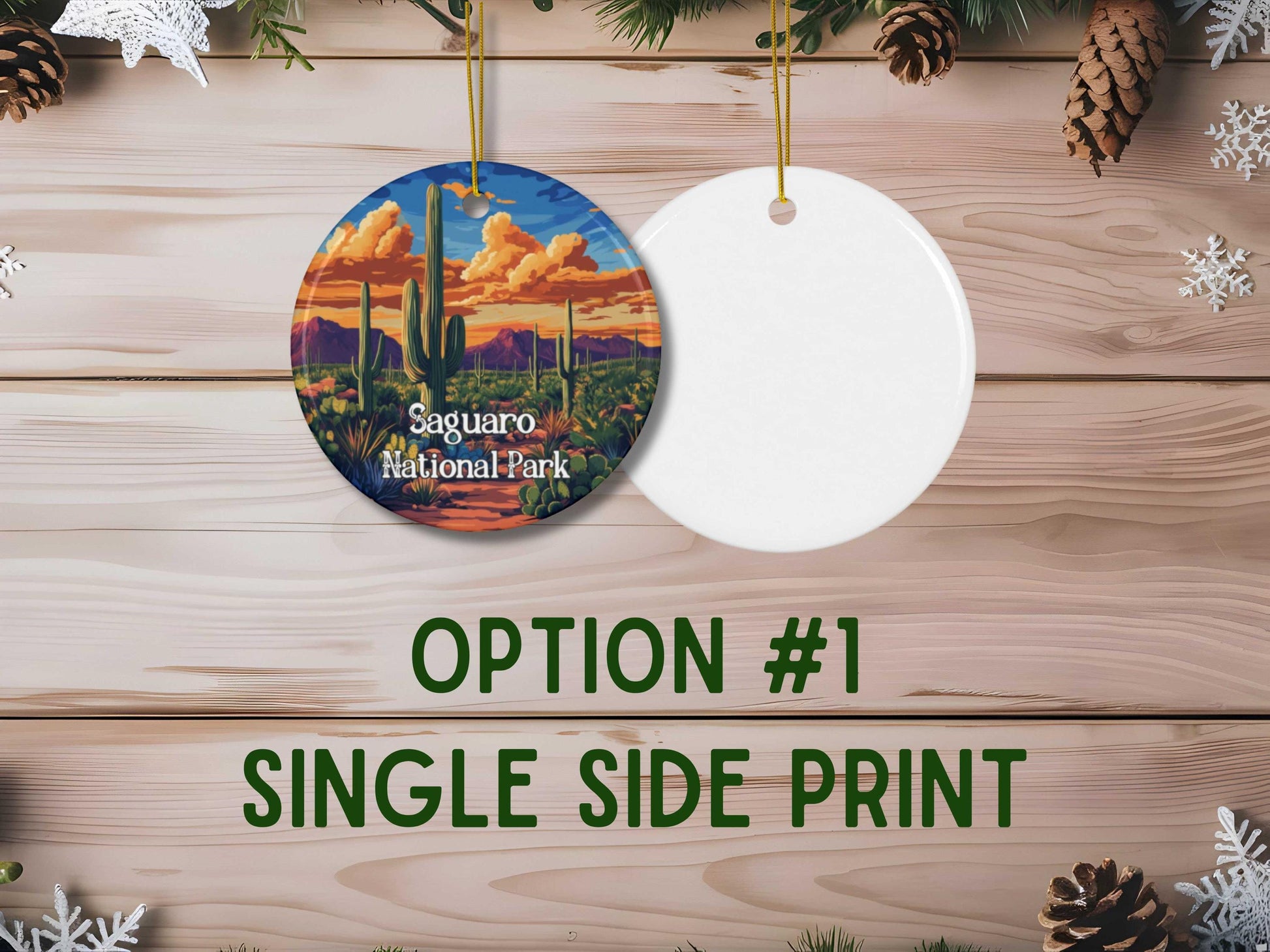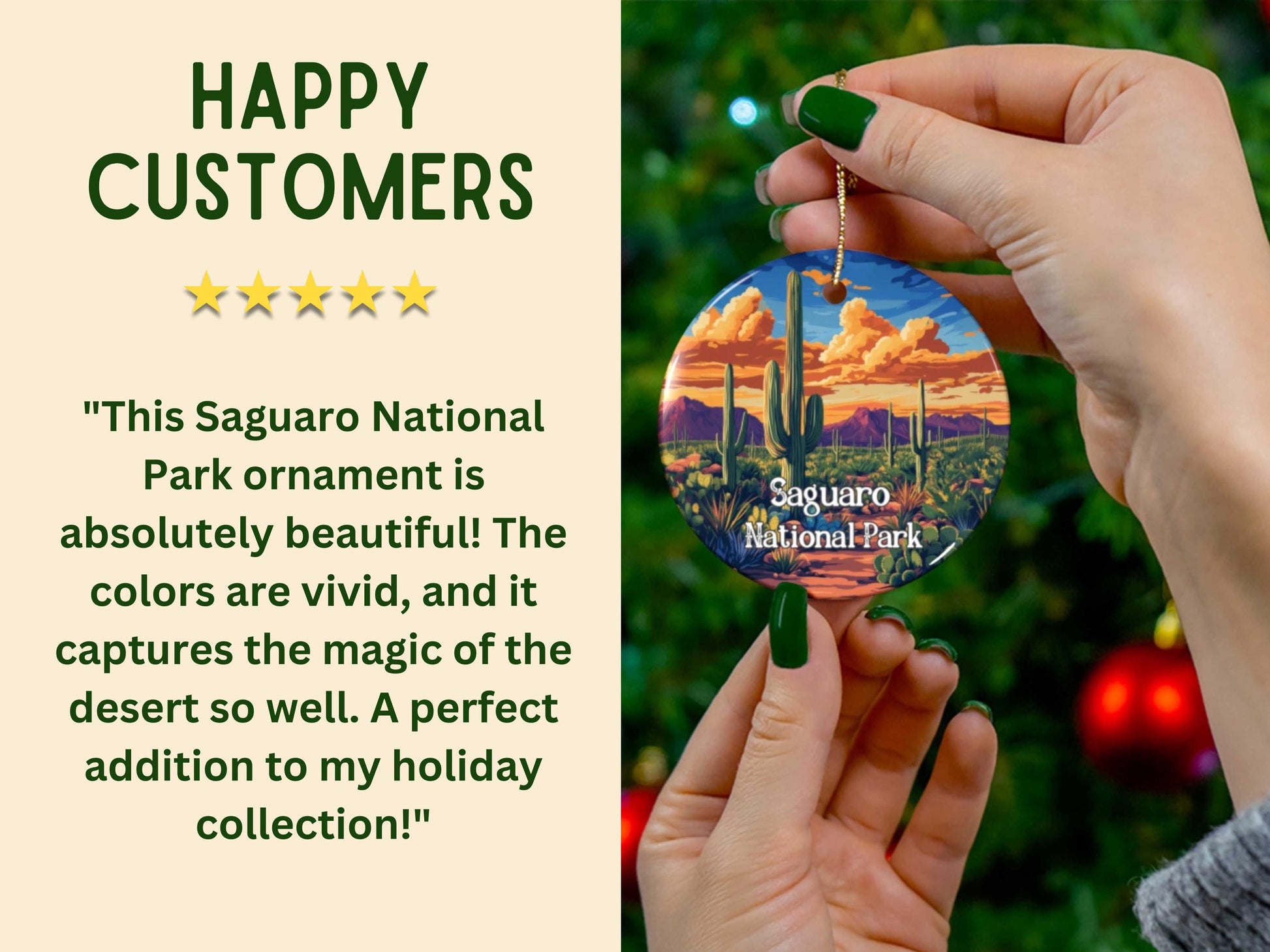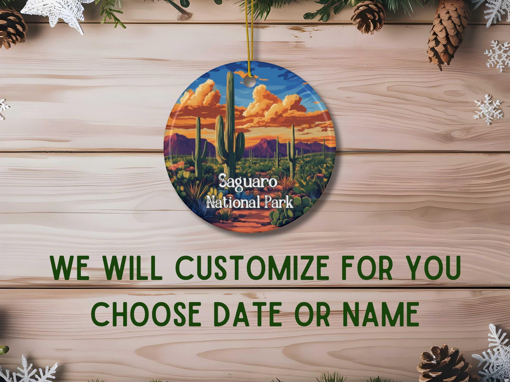 Celebrate the beauty of Saguaro National Park with this vibrant illustrated ceramic ornament. Featuring iconic cacti against a stunning desert sunset, this piece captures the essence of the American Southwest and makes a unique addition to any holiday decor.We will personalize, just let us know what you would like printed your ornament.