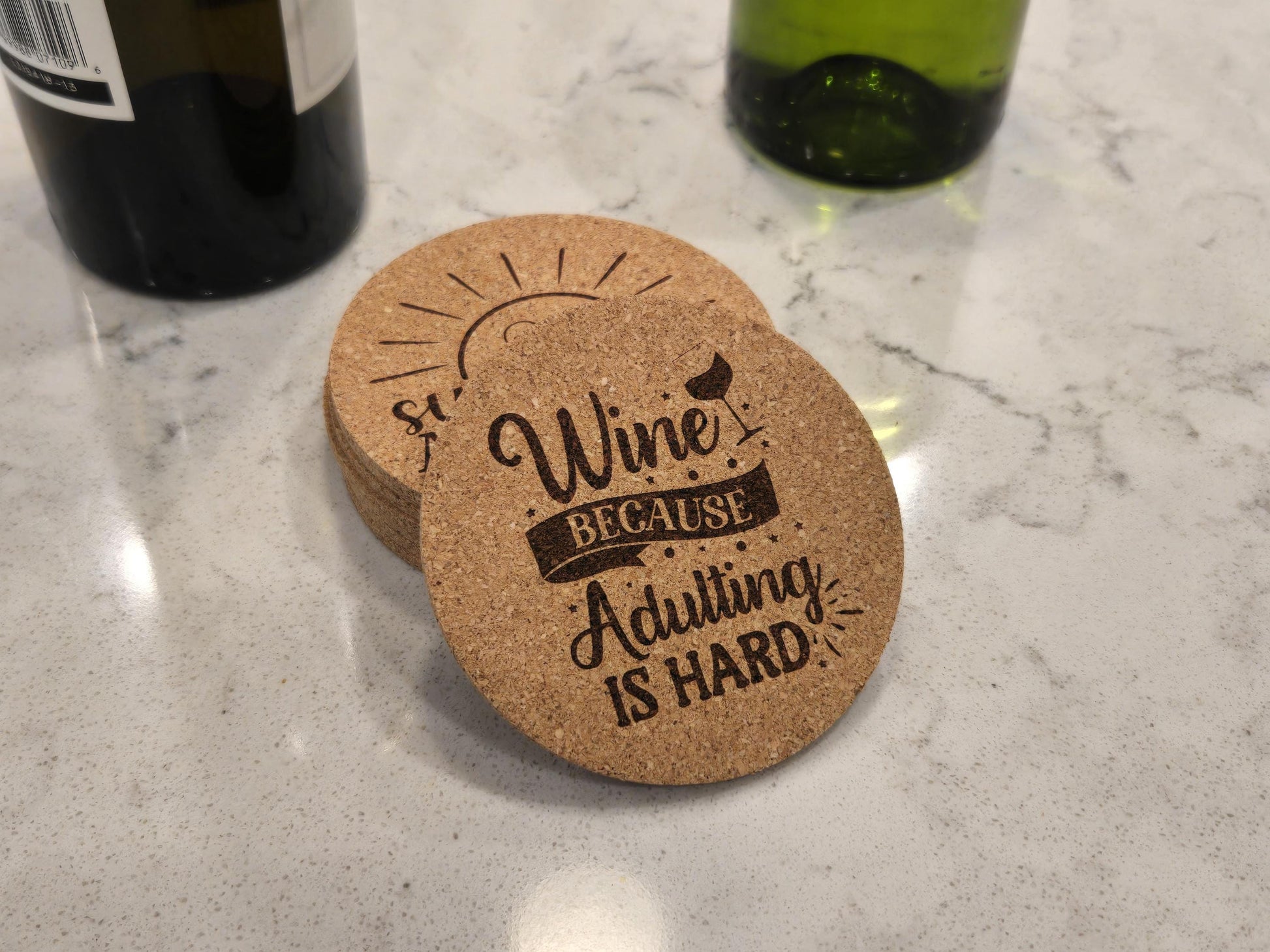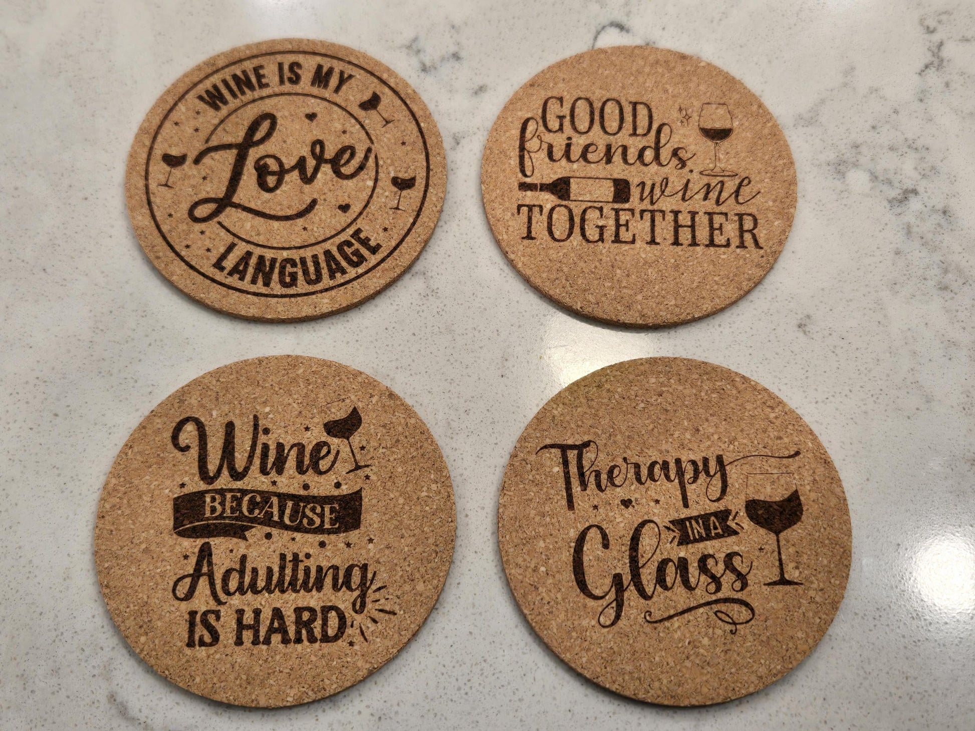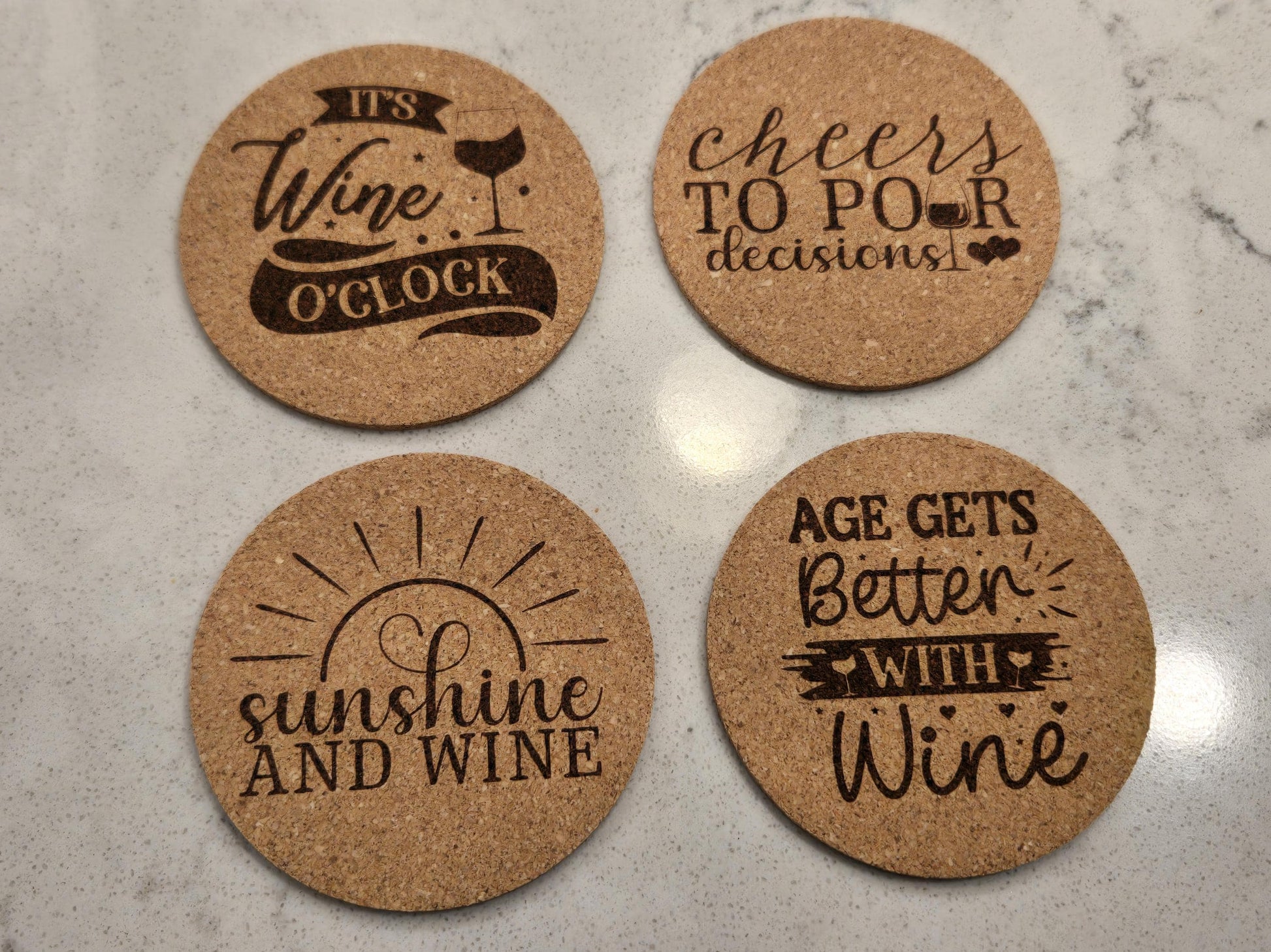 Great for home bars, wine parties, housewarming, or as a unique hostess gift. Made from eco-friendly cork, these coasters protect surfaces while adding charm to any wine night!