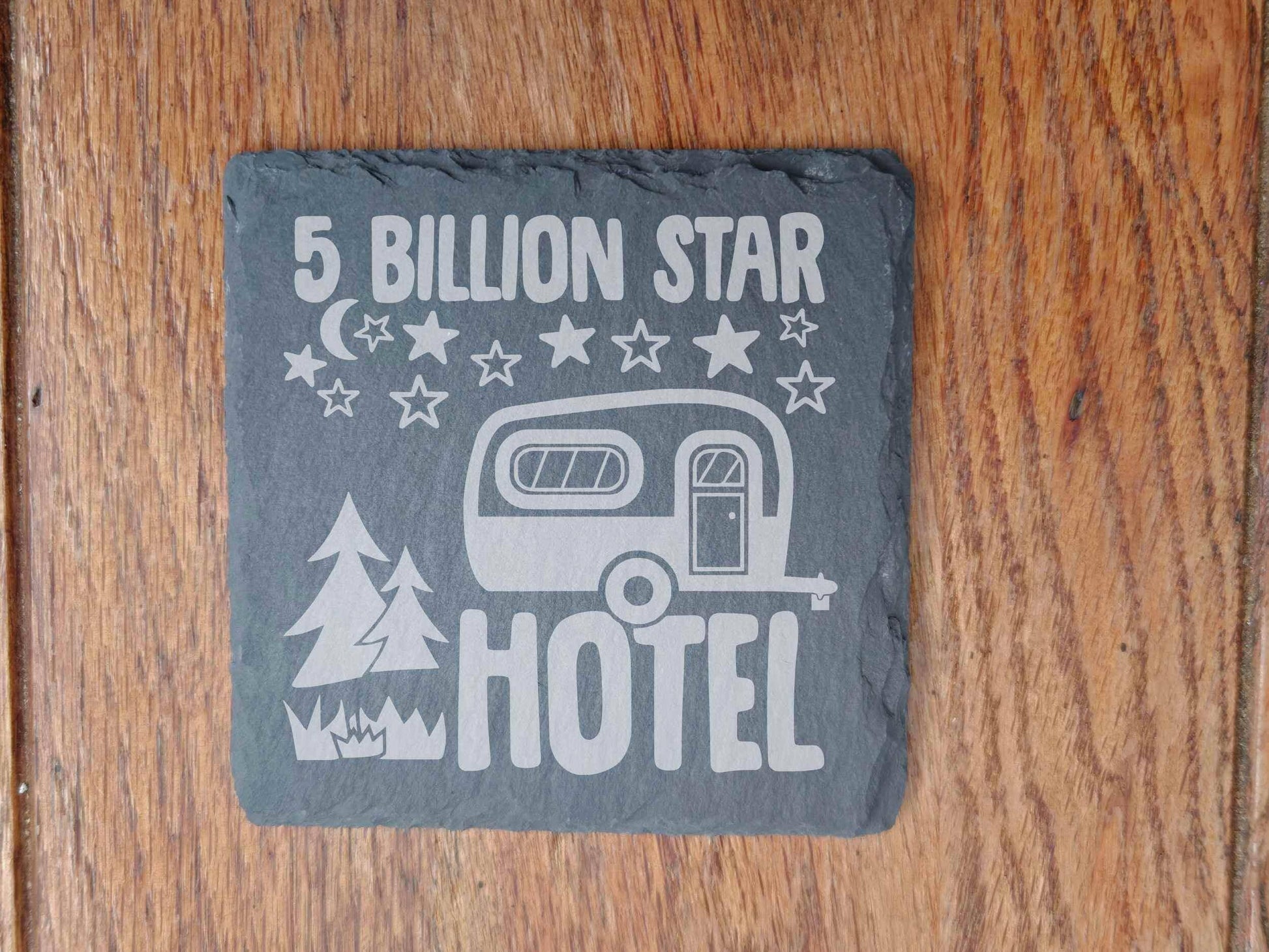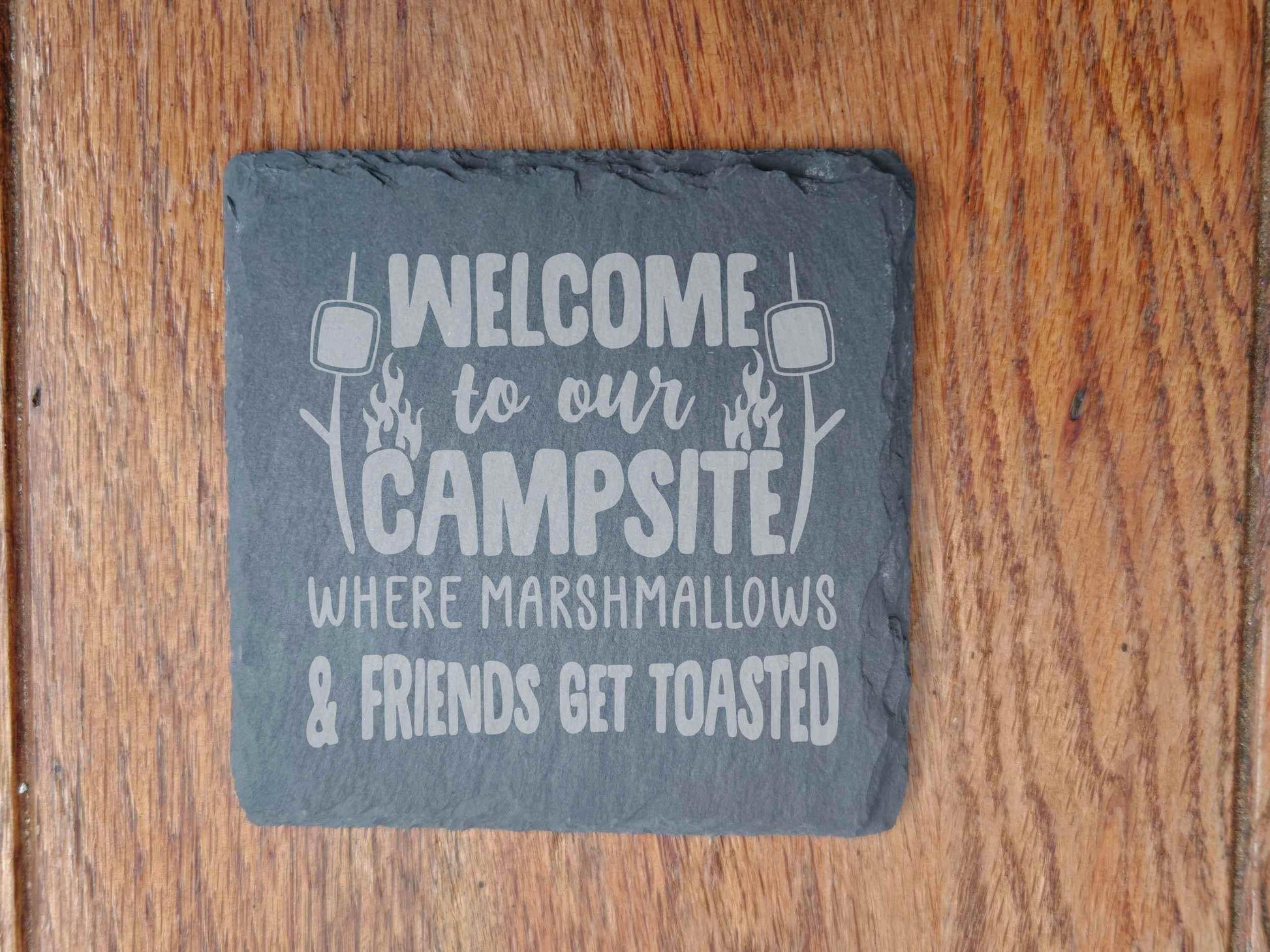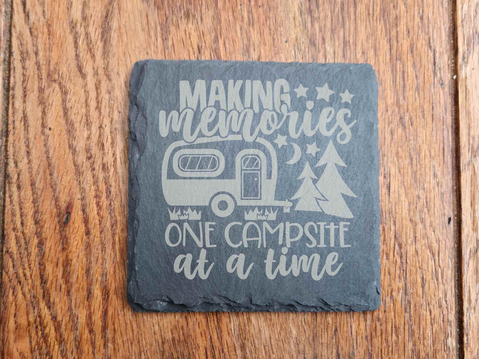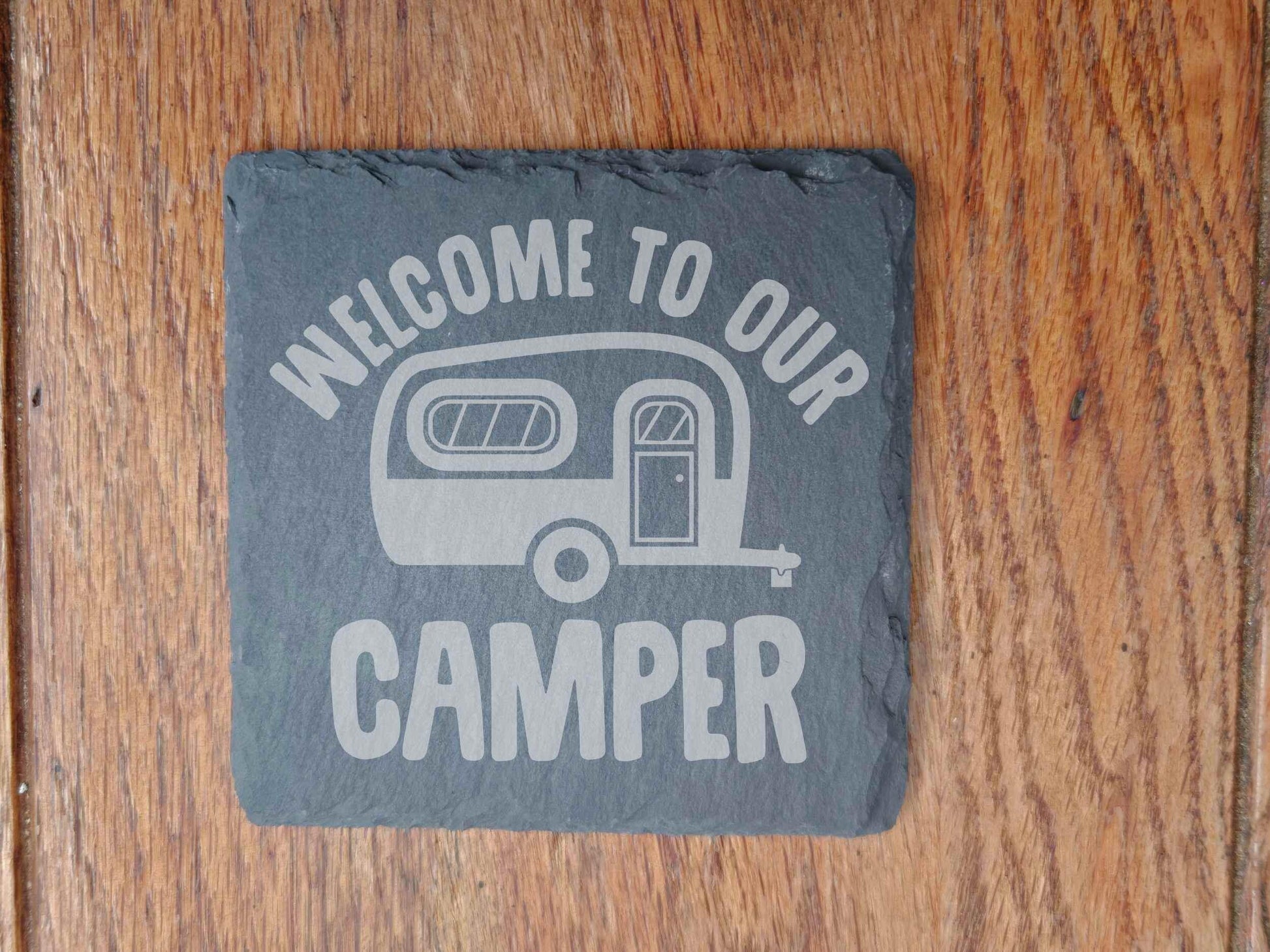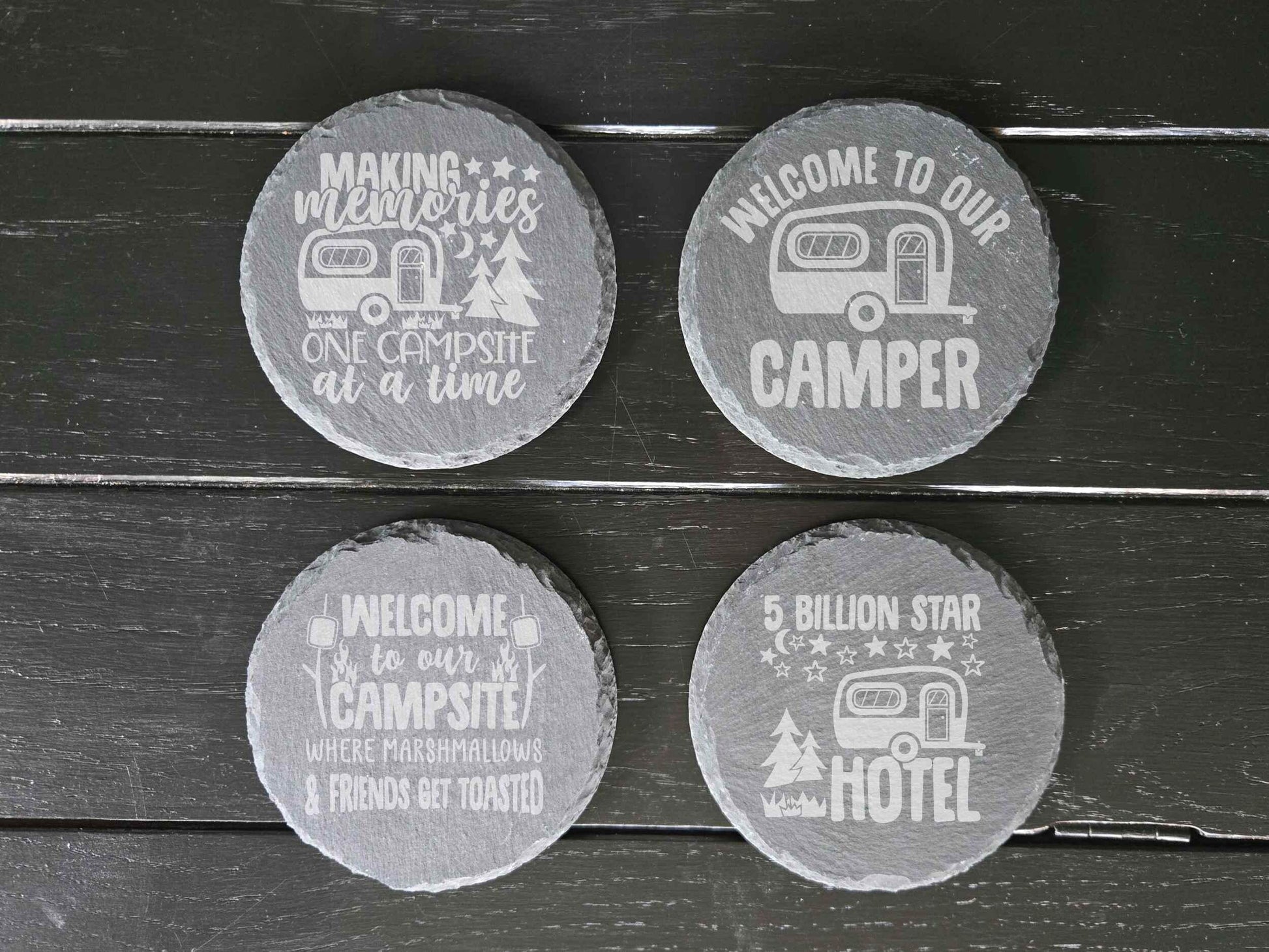 Four engraved stone camping drink coasters! Choose between round or square. Great for RVs, campsites, or as a unique camper gift.