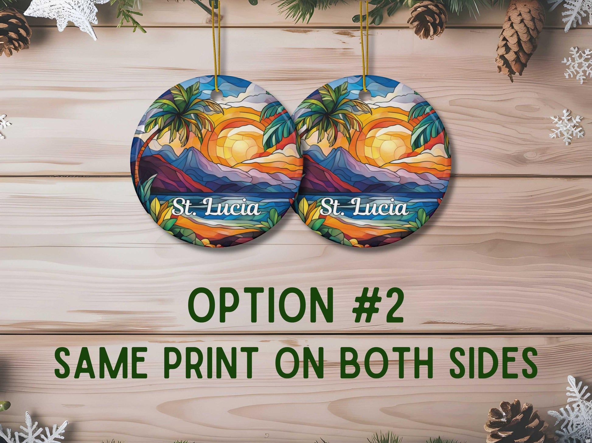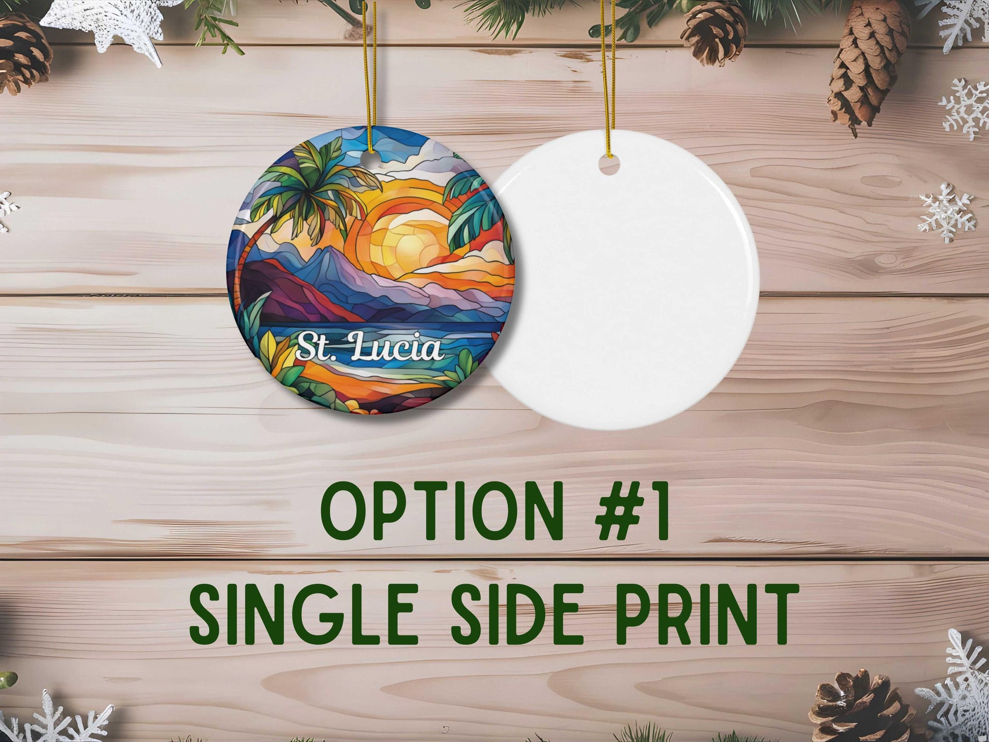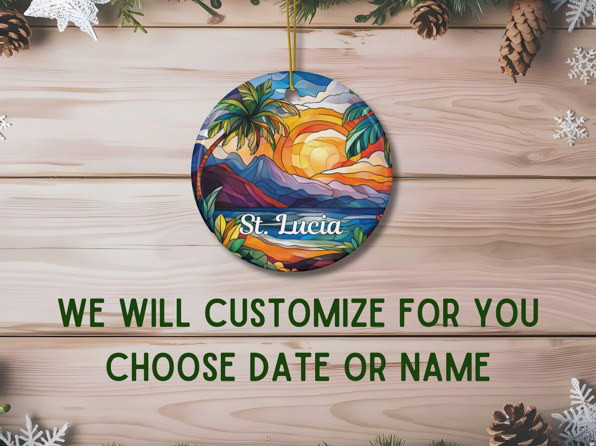 Our faux stained glass St. Lucia Ornament is customizable and you can choose to print on one or both sides. Its solid one-piece construction ensures durability, and the included hanging string allows for easy display. Personalization will go below "St. Lucia."