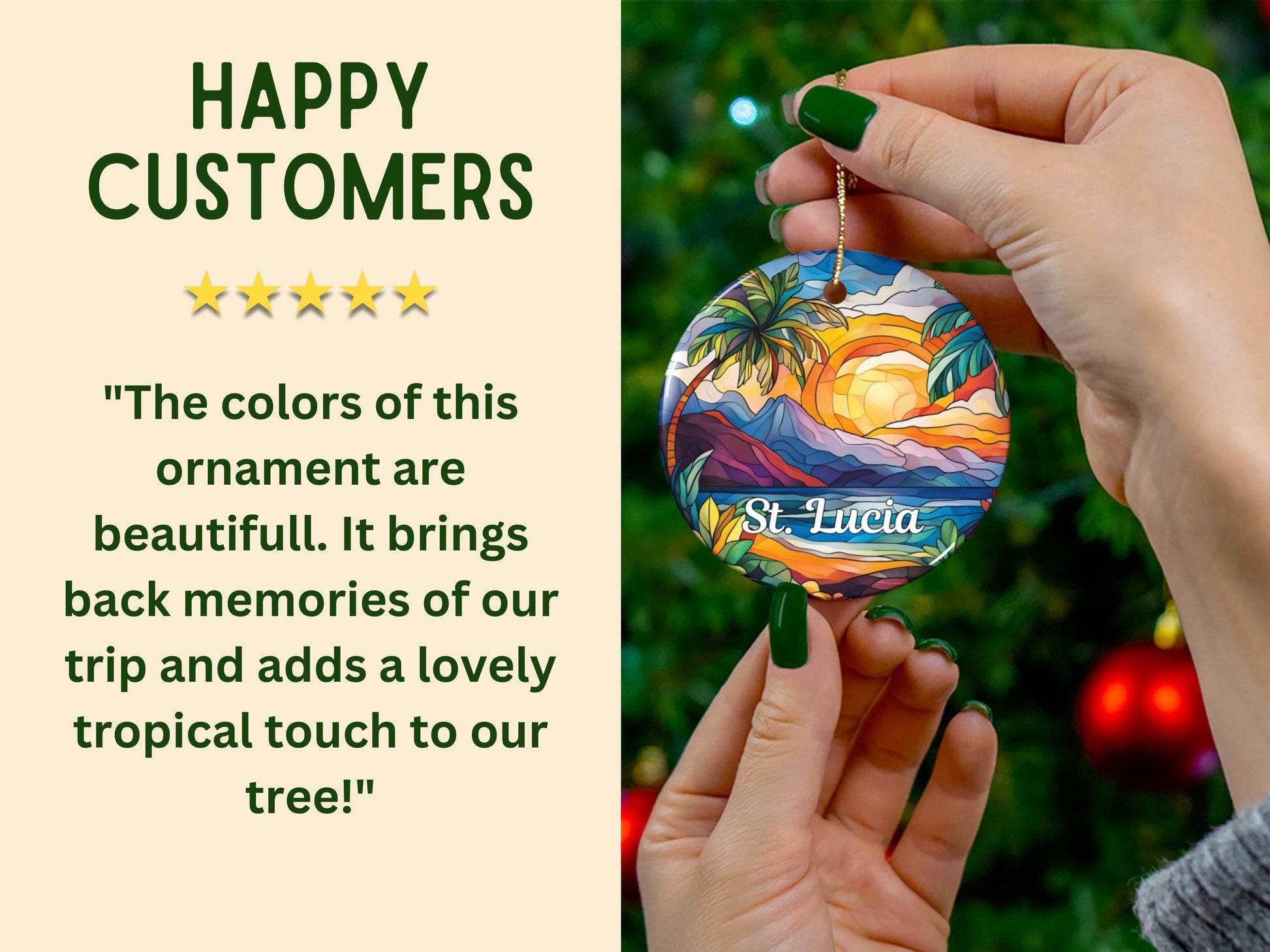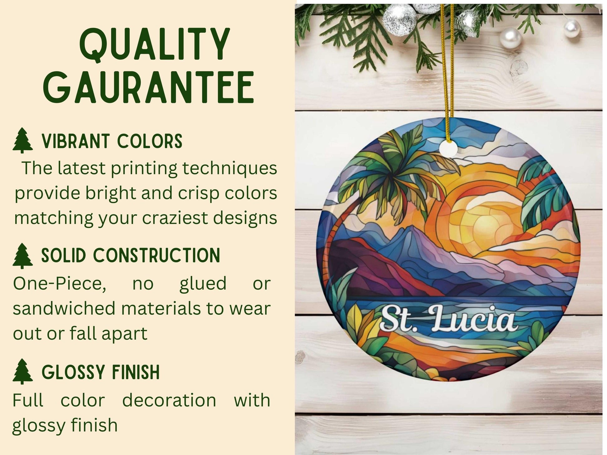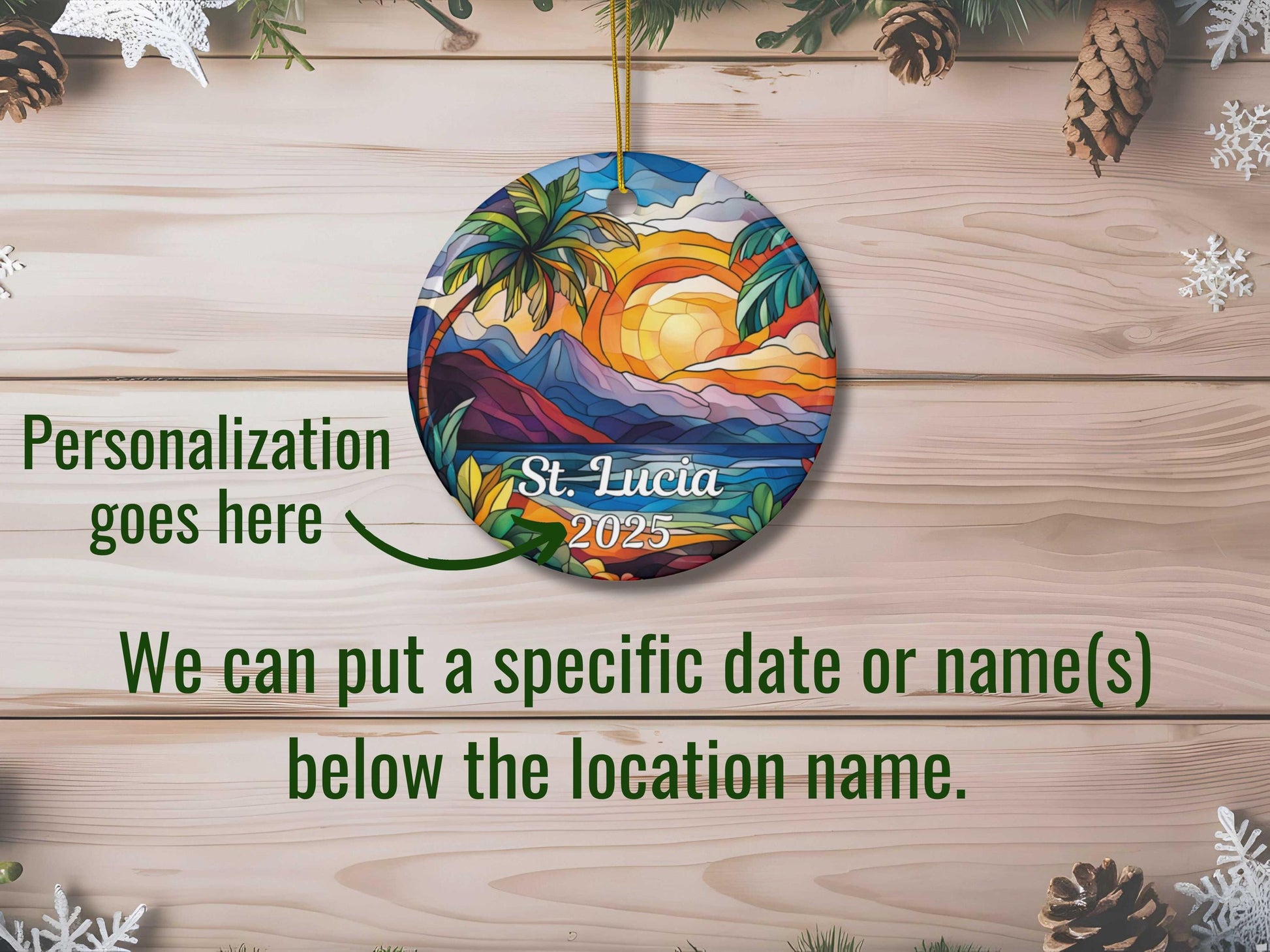 Our faux stained glass St. Lucia Ornament is customizable and you can choose to print on one or both sides. Its solid one-piece construction ensures durability, and the included hanging string allows for easy display. Personalization will go below "St. Lucia."