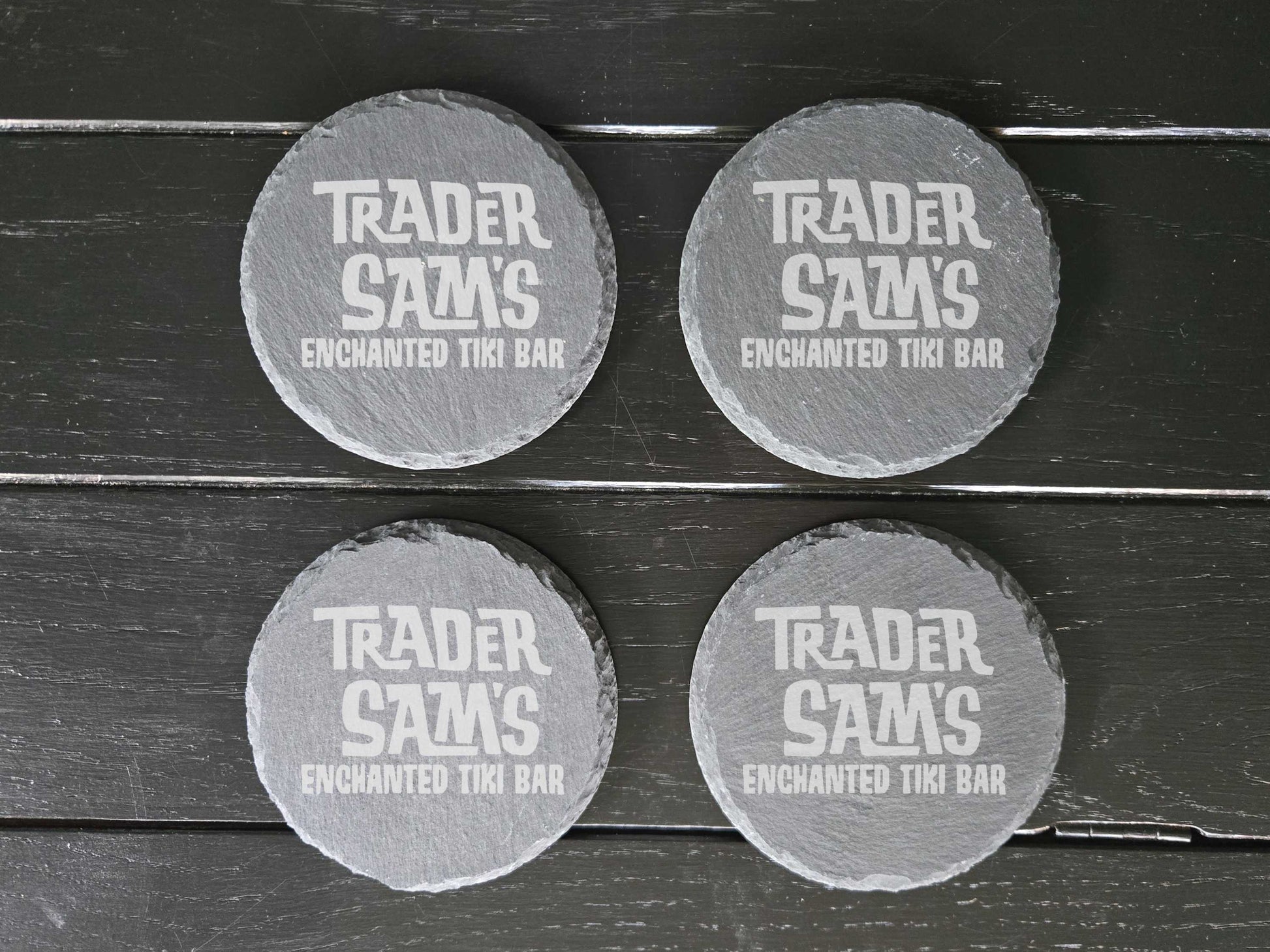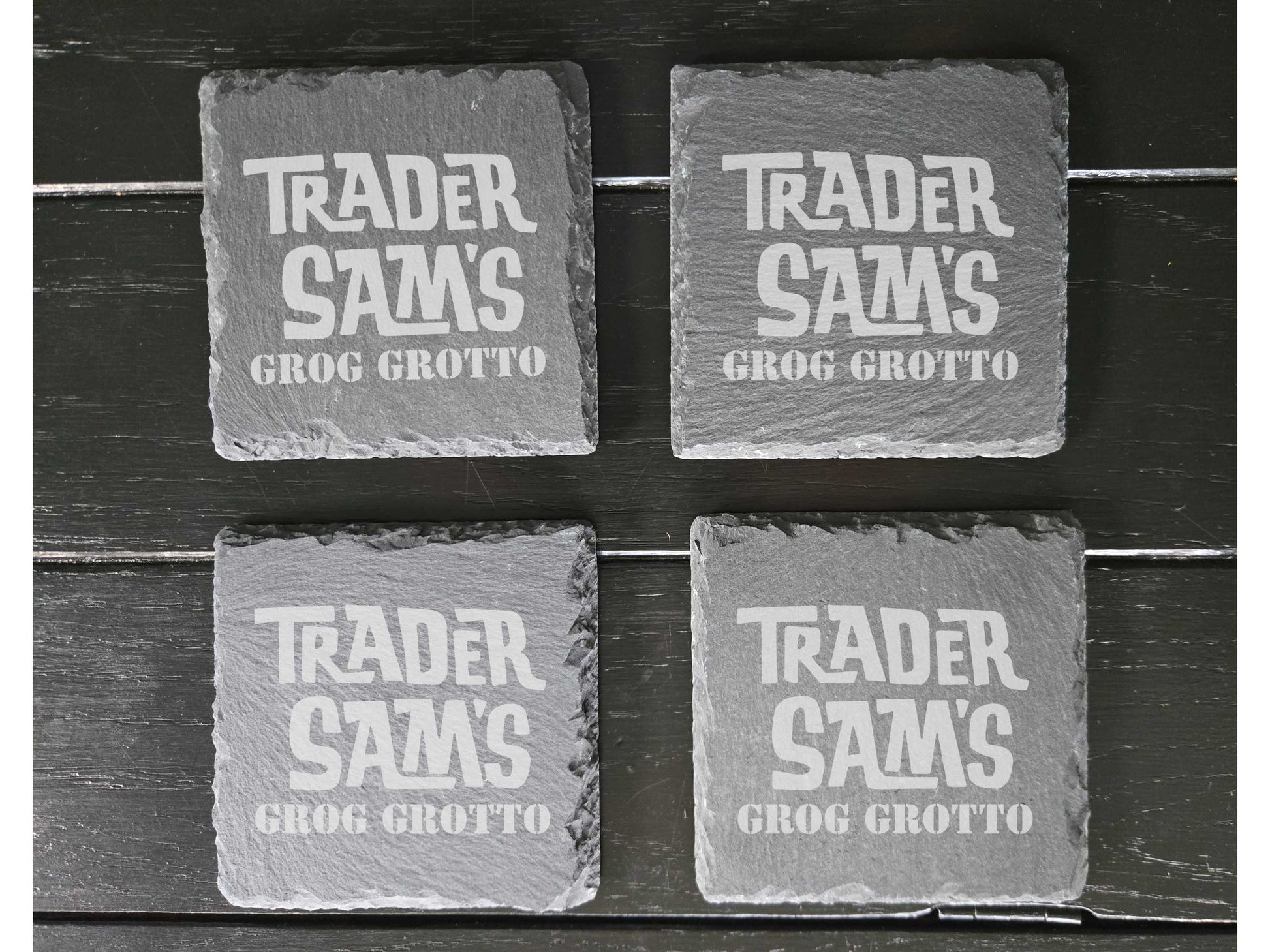 Four engraved Trader Sam's stone drink coasters! Two designs to choose from, Disneyland's Trader Sam's Tropical Tiki Bar, or Disney World's Trader Sam's Grog Grotto.