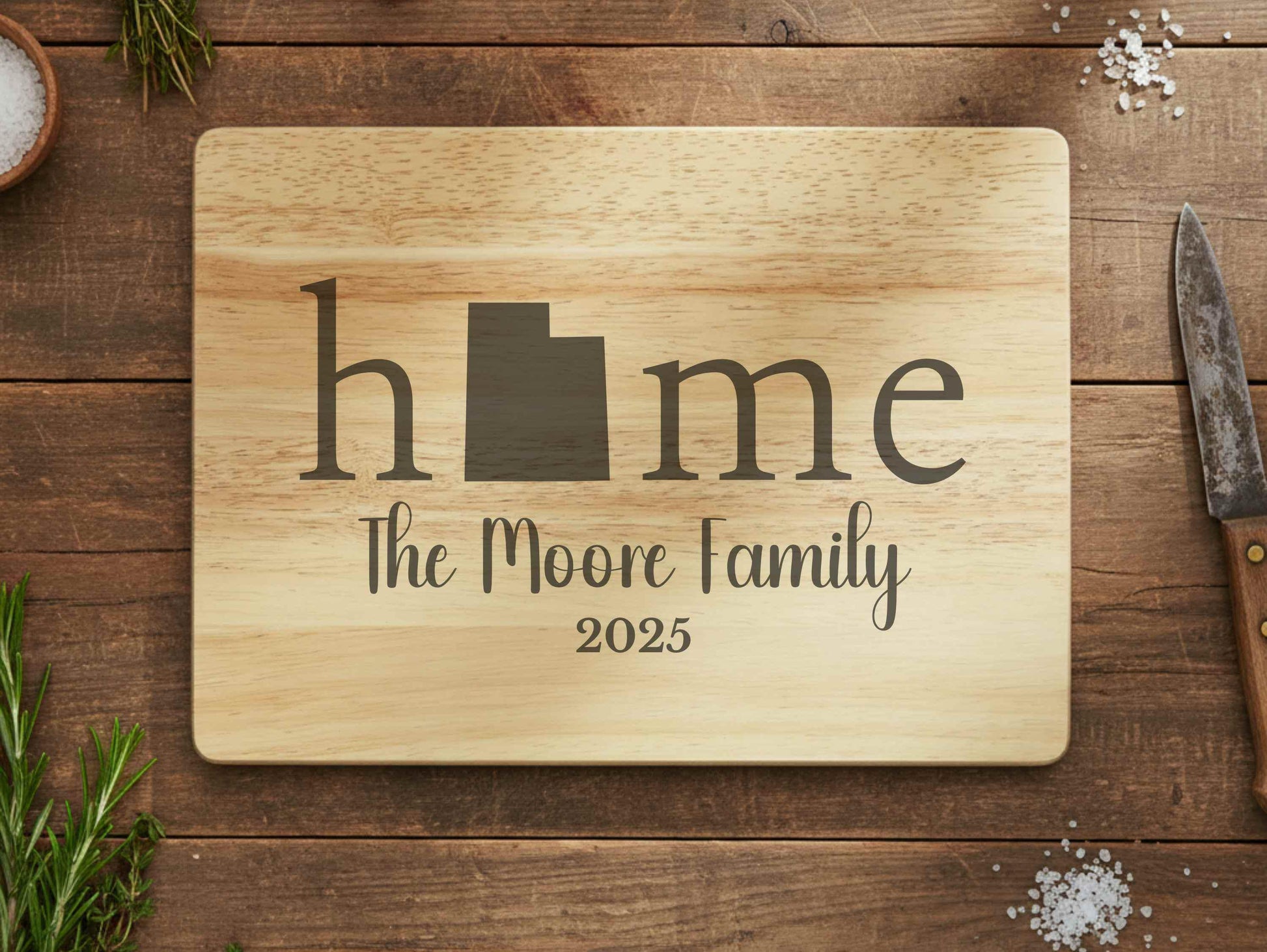 Celebrate your roots or honor a new beginning with our beautifully engraved Utah Home cutting board, featuring the shape of Utah in place of the "O". This handcrafted acacia wood board makes the perfect personalized gift for weddings, housewarmings, anniversaries, or real estate closings.