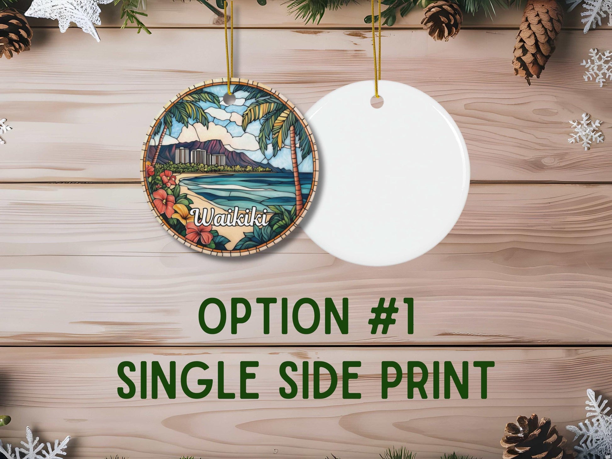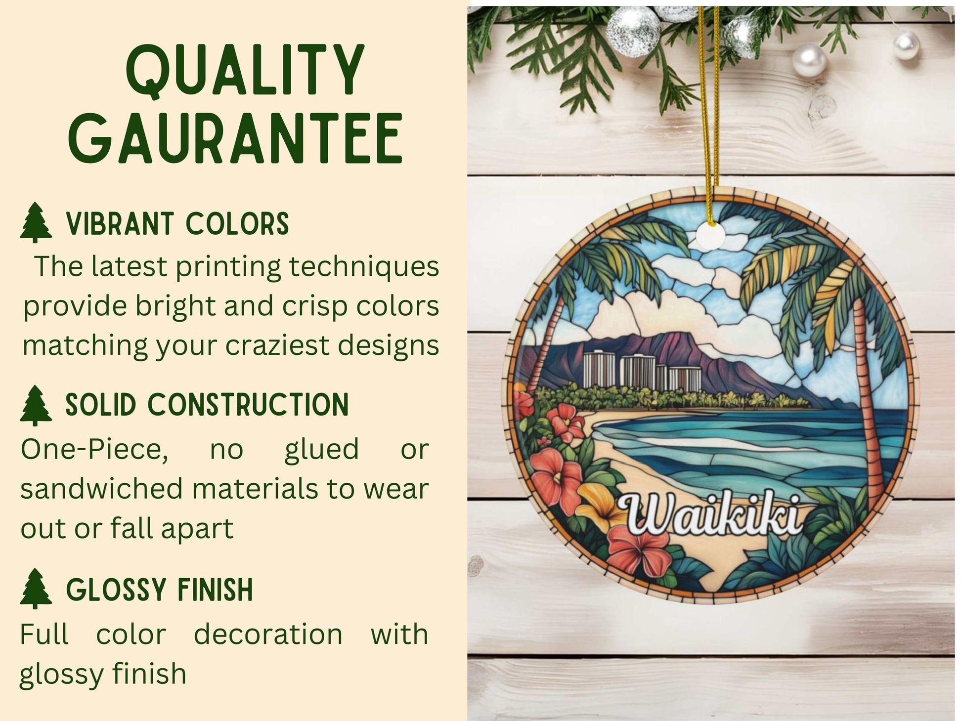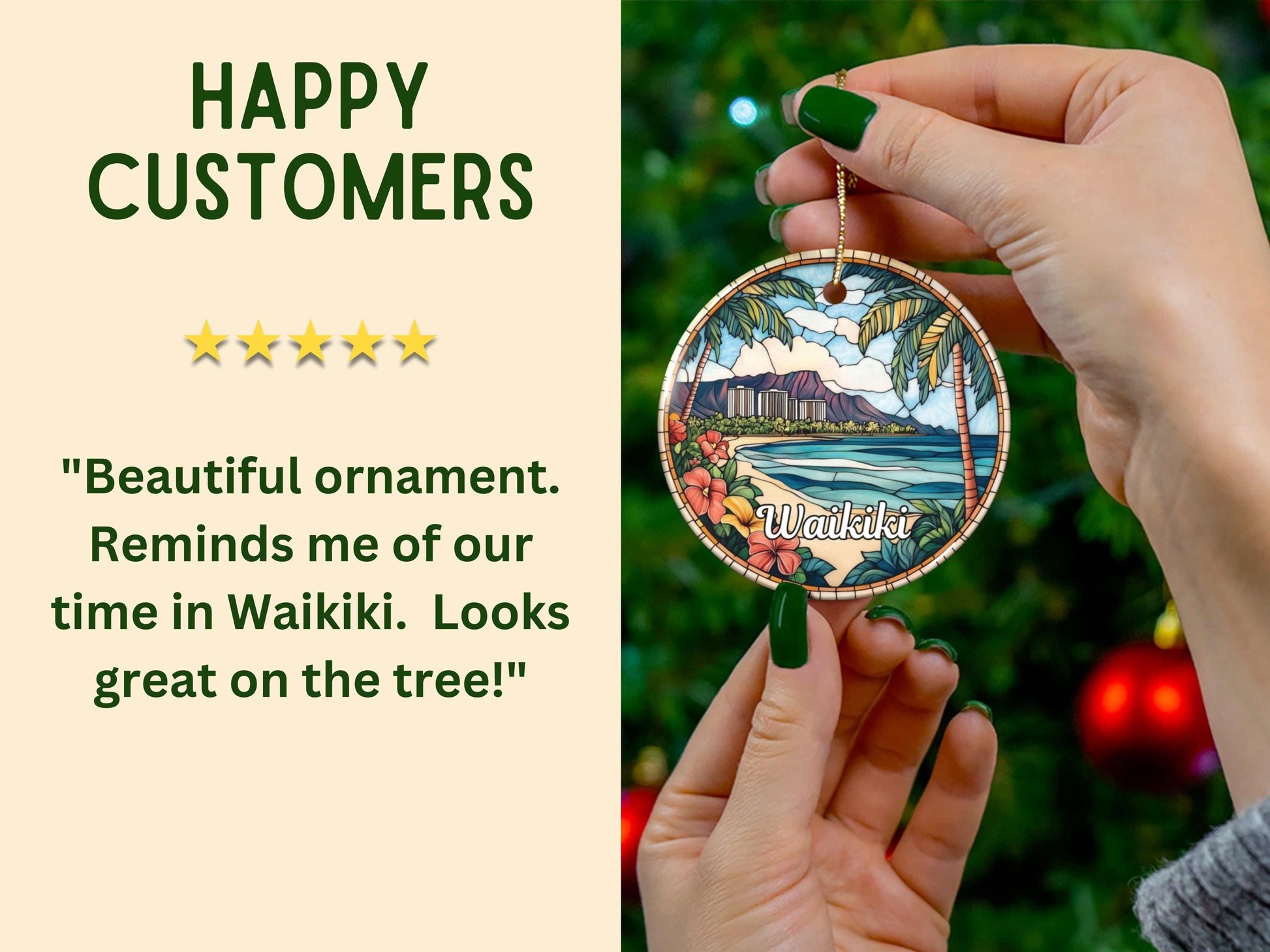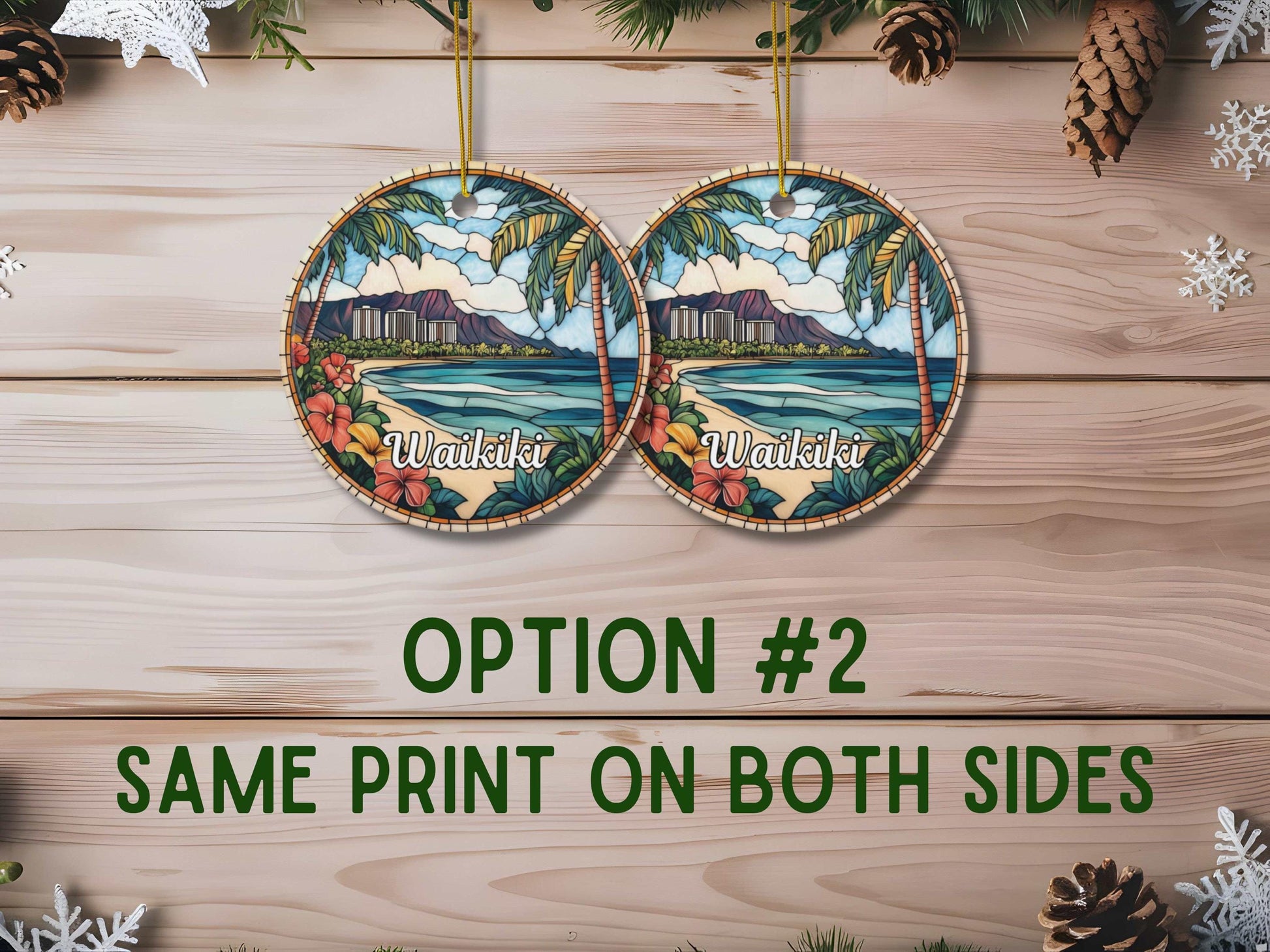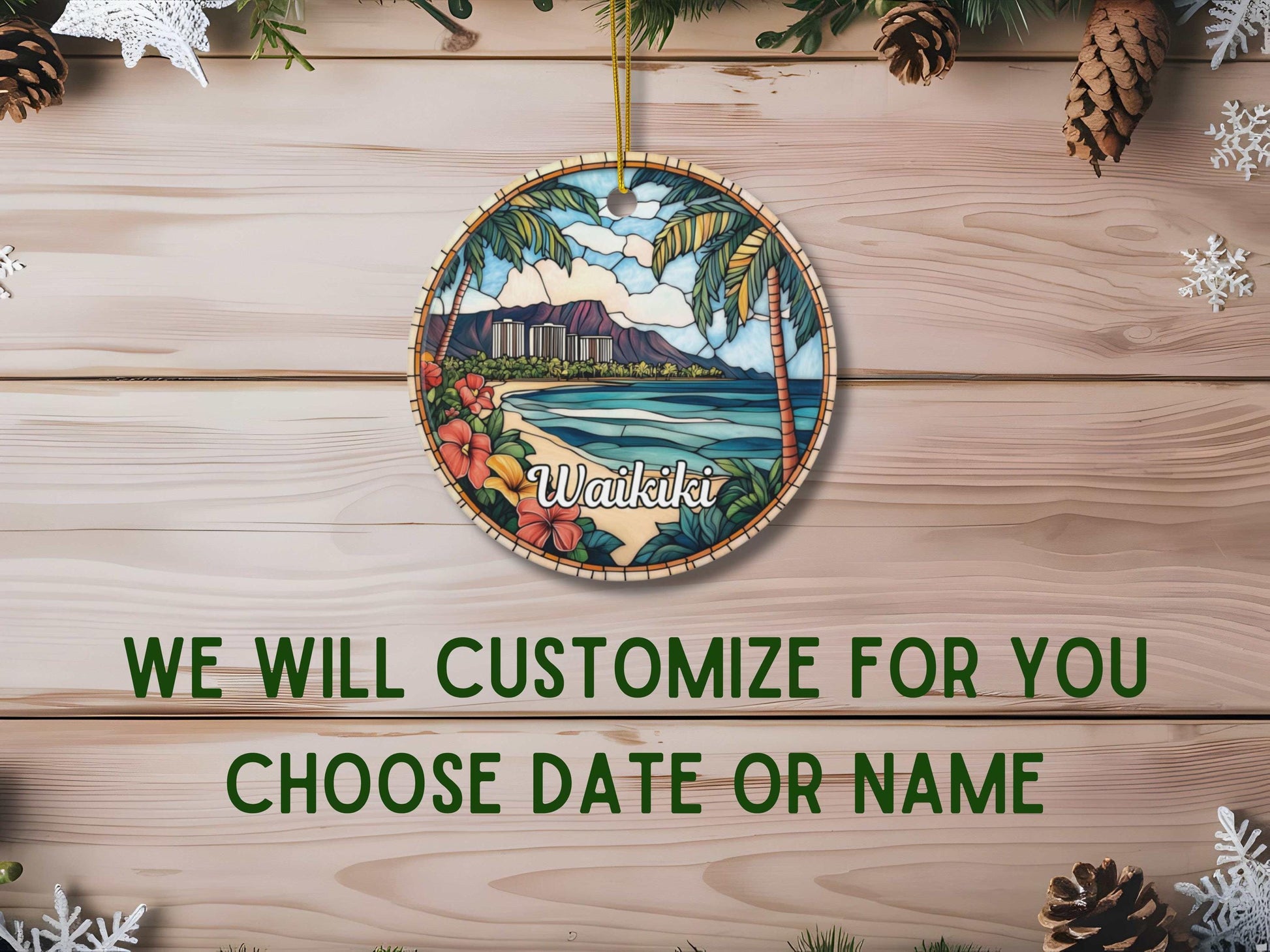Beautiful illustrated Waikiki beach ornament. Fully customizable. We can add names, dates, or a specific location that you would like .Personalization will be on both sides if you choose print on both sides.