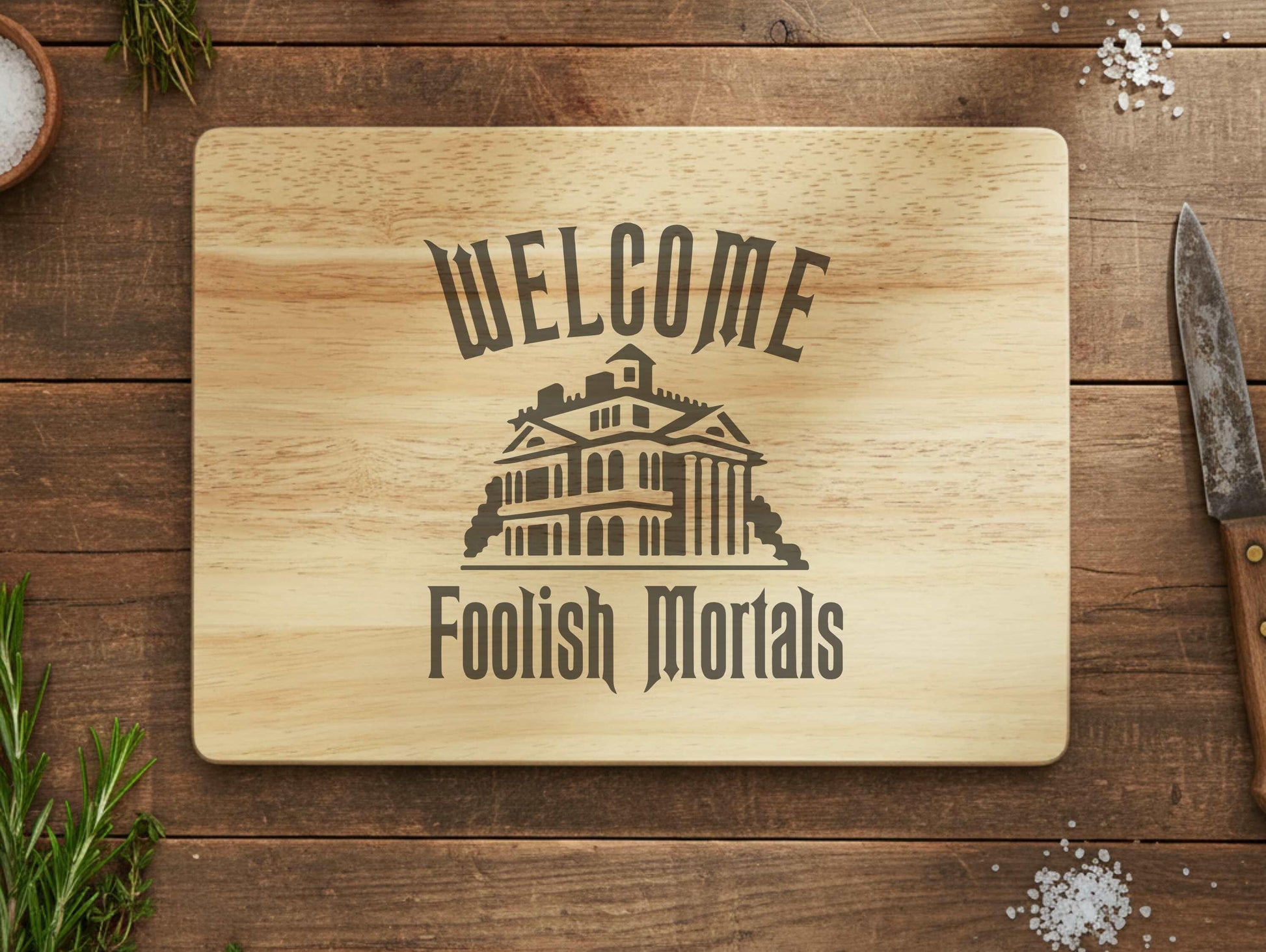Add a haunted touch to your kitchen with our Welcome Foolish Mortals wood cutting board! Perfect gift for Haunted Mansion lovers.