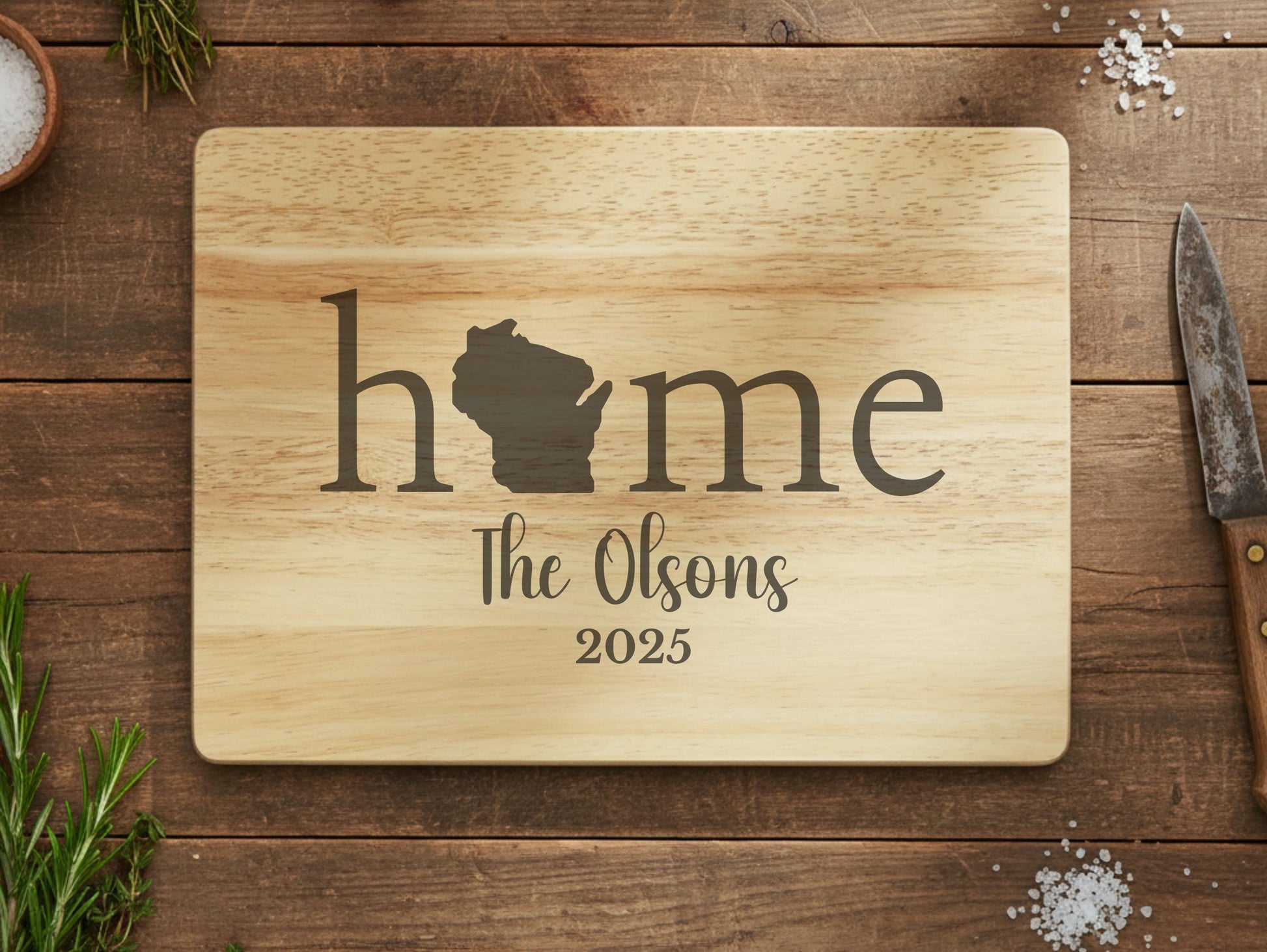 Celebrate your roots or honor a new beginning with our beautifully engraved Wisconsin Home cutting board, featuring the shape of Wisconsin in place of the "O". This handcrafted acacia wood board makes the perfect personalized gift for weddings, housewarmings, anniversaries, or real estate closings.
